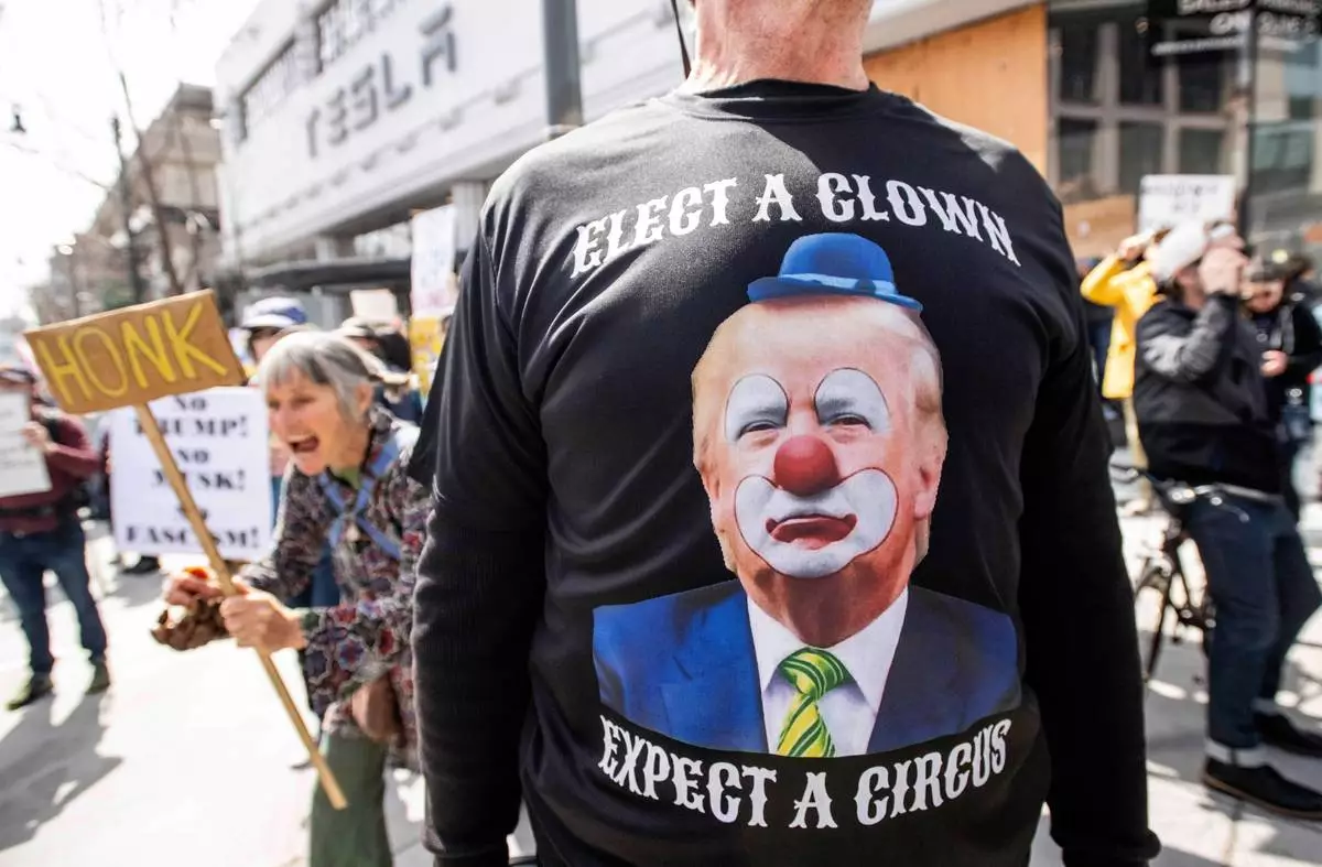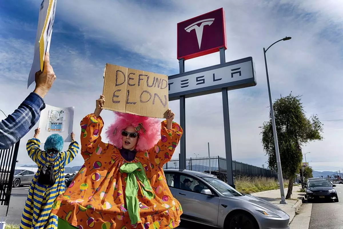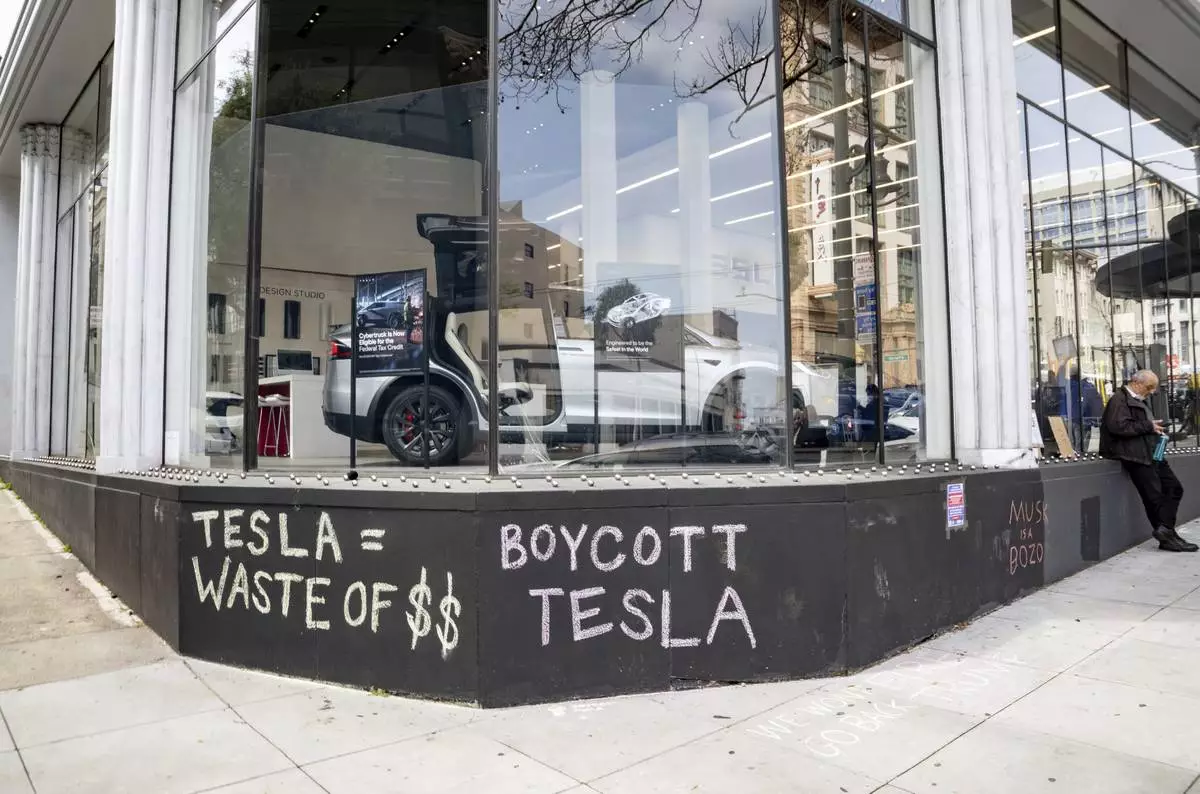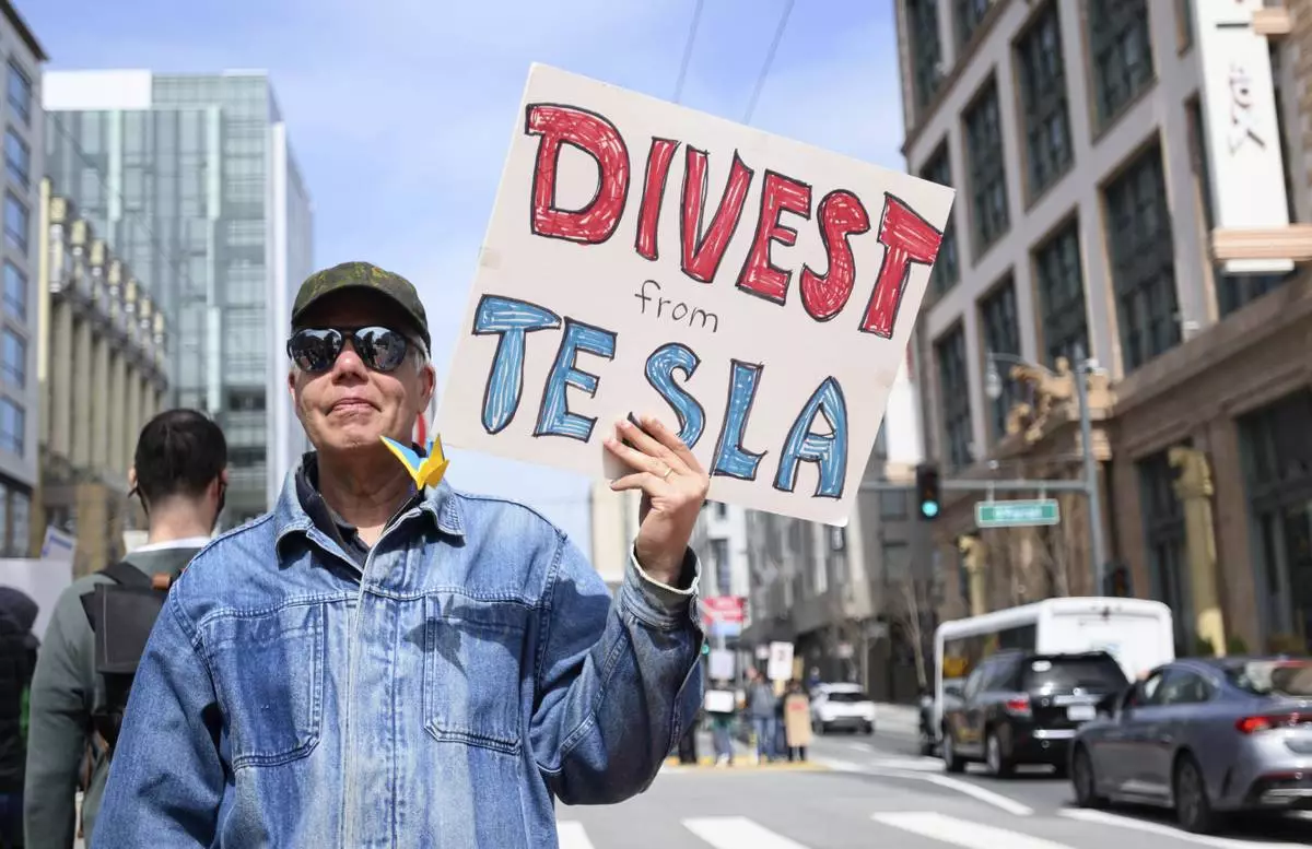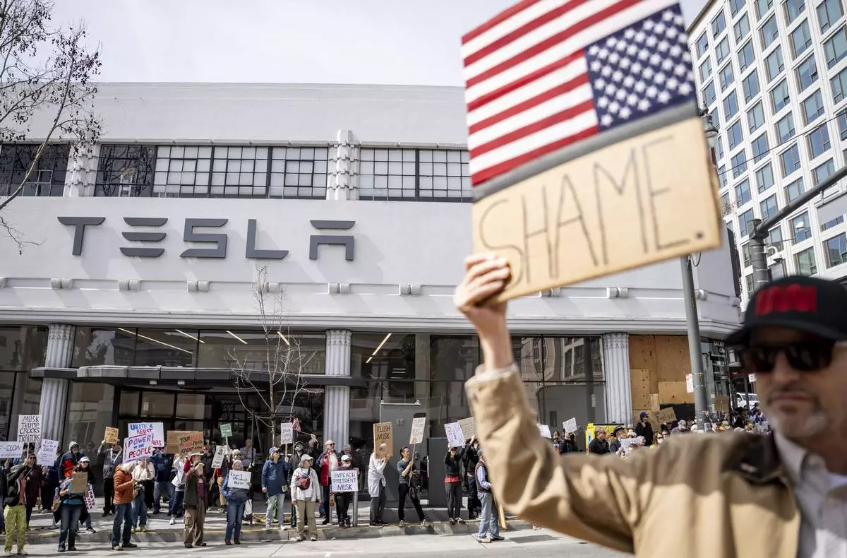 Protesters rally outside a Tesla dealership in San Francisco, Saturday, March 15, 2025. (AP Photo/Josh Edelson)