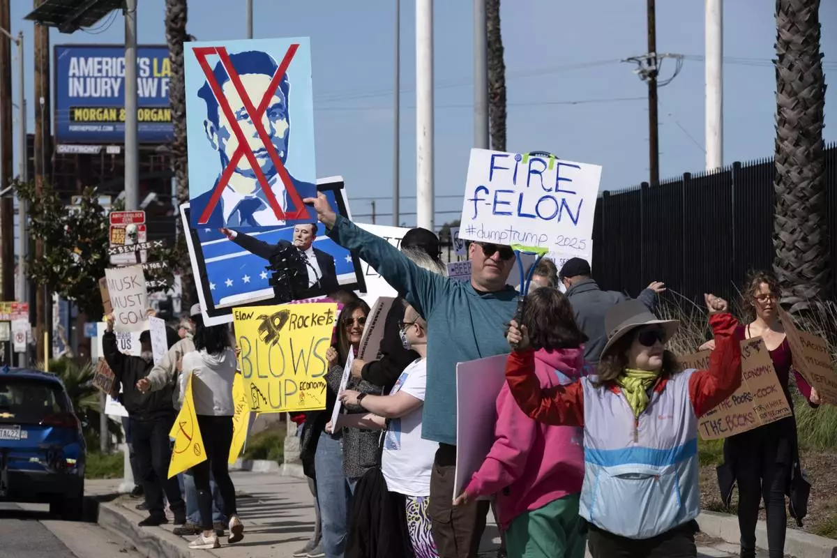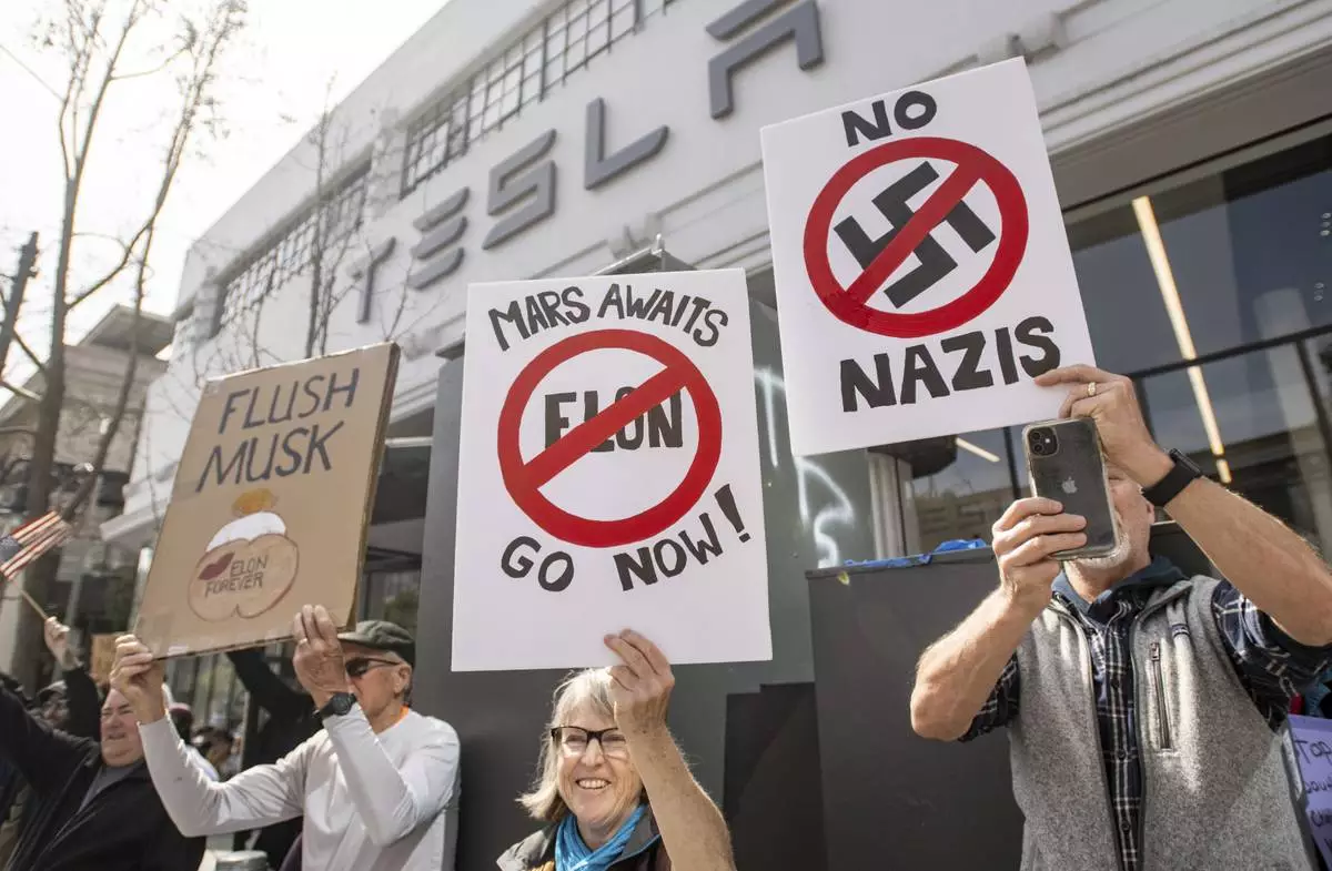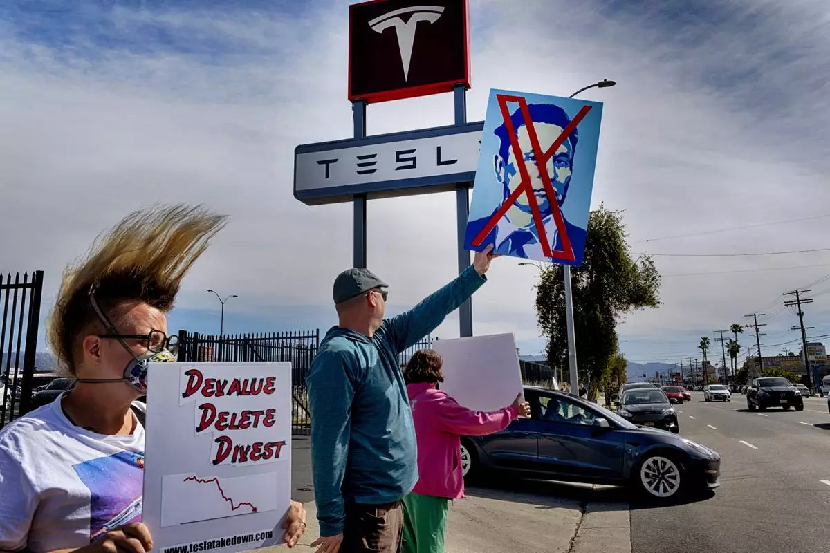 Protesters carrying signs and chanting slogans stand outside a Tesla showroom and service center in the North Hollywood section of Los Angeles on Saturday, March 15, 2025. (AP Photo/Richard Vogel)