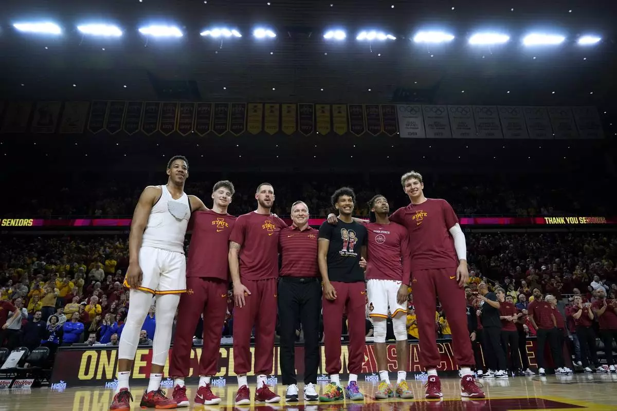Iowa State head coach T.J. Otzelberger, center, stands with seniors Dishon Jackson, from left, Nate Heise, Conrad Hawley, Curtis Jones, Keshon Gilbert and Brandton Chatfield before an NCAA college basketball game against BYU, Tuesday, March 4, 2025, in Ames, Iowa. (AP Photo/Charlie Neibergall)