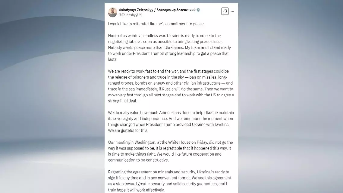 In a post on the social media platform X on Tuesday, Zelensky stressed nobody wants peace more than Ukrainians and said he stands ready "to work under President Trump's strong leadership" to achieve lasting peace.