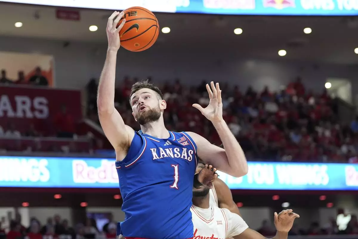 Kansas's Hunter Dickinson (1) goes up for a shot as Houston's Ja'Vier Francis defends during the first half of an NCAA college basketball game Monday, March 3, 2025, in Houston. (AP Photo/David J. Phillip)