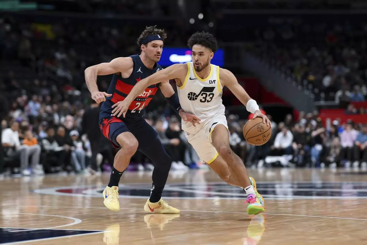 Utah Jazz guard Johnny Juzang (33) handles the ball against Washington Wizards forward Corey Kispert (24) during the first half of an NBA basketball game, Wednesday, Mar. 5, 2025, in Washington. (AP Photo/Terrance Williams)
