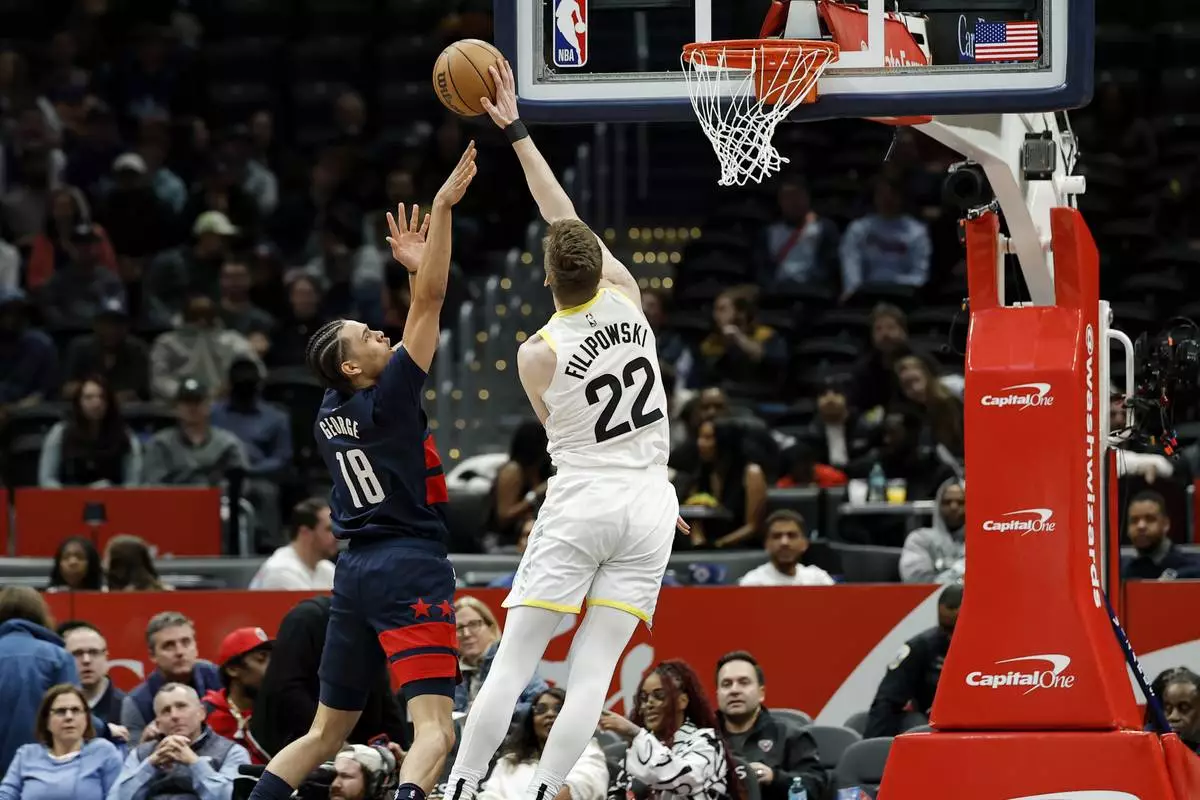 Washington Wizards forward Kyshawn George (18) has his shot blocked by Utah Jazz forward Kyle Filipowski (22) during the first half of an NBA basketball game, Wednesday, Mar. 5, 2025, in Washington. (AP Photo/Terrance Williams)