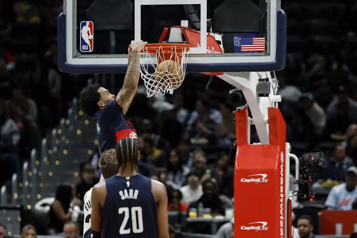 Washington Wizards forward Justin Champagnie dunks the ball during the first half of an NBA basketball game against the Utah Jazz, Wednesday, Mar. 5, 2025, in Washington. (AP Photo/Terrance Williams)