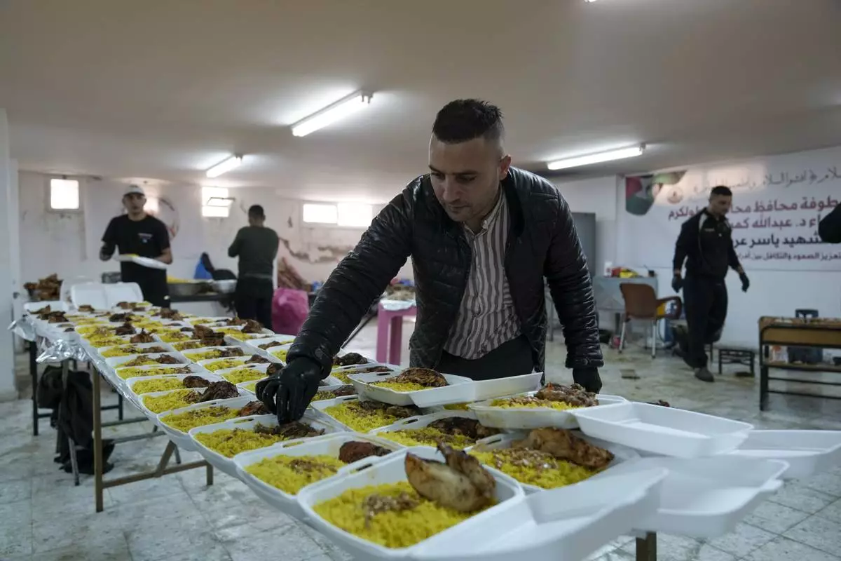 TULKAREM, West Bank (AP) — At a makeshift kitchen inside a city office building, volunteers rub paprika, oil and salt on slabs of chicken before arraying them on trays and slipping them into an oven. Once the meat is done, it is divided into portions and tucked into plastic foam containers along with piles of yellow rice scooped from large steel pots.