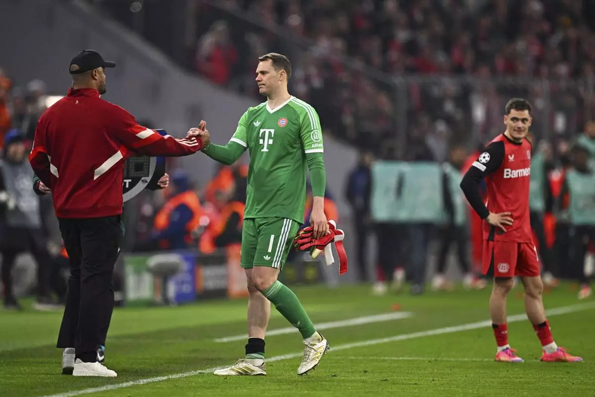Munich's goalkeeper Manuel Neuer, center, walks off the pitch during the Champions League round of 16 first leg soccer match between FC Bayern Munich and Bayer 04 Leverkusen in Munich, Germany, Wednesday, March 5, 2025. (Tom Weller/dpa via AP)