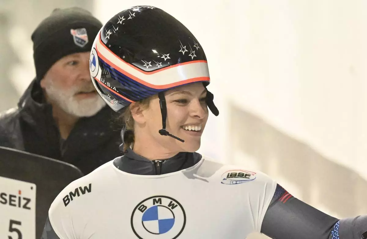 FILE - Kelly Curtis, of The United States, reacts in the finish area after the second run of the women's skeleton World Cup race on Friday, Dec. 16, 2022, in Lake Placid, N.Y. (AP Photo/Hans Pennink)