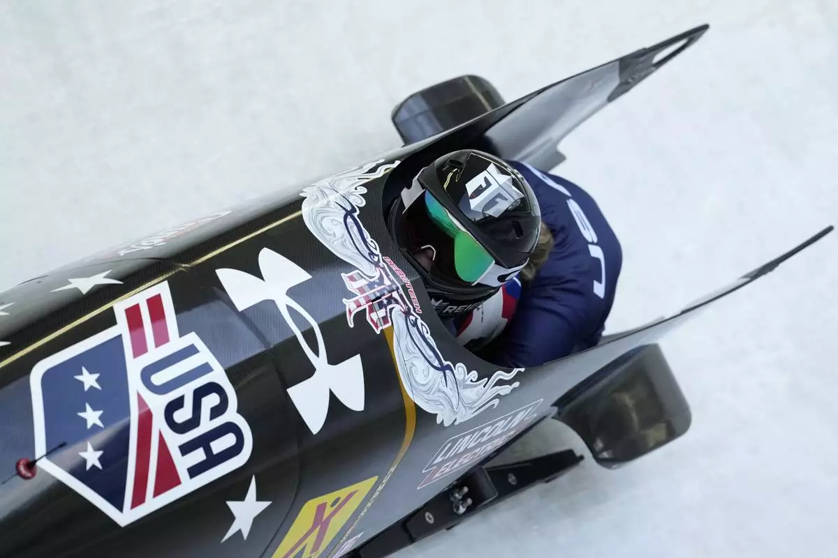 FILE - Kaillie Armbruster Humphries and Lolo Jones, of the United States, speed down the track during the first run of the 2-woman bobsleigh, at the Bobsleigh World Cup in Innsbruck, Austria, Sunday, Jan. 19, 2025. (AP Photo/Matthias Schrader)
