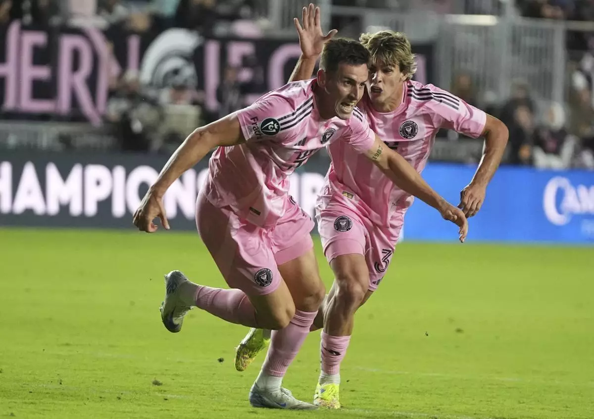 Inter Miami forward Tadeo Allende, left, celebrates with midfielder Benjamin Cremaschi, right, after scoring a goal during the second half of a CONCACAF Champions Cup soccer match against Cavalier Thursday, March 6, 2025, in Fort Lauderdale, Fla. (AP Photo/Lynne Sladky)