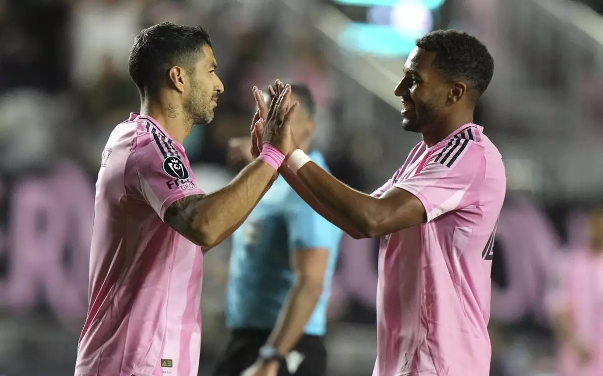 Inter Miami forward Luis Suárez, left, is congratulated by midfielder Yannick Bright (42) after scoring a goal during the second half of a CONCACAF Champions Cup soccer match against Cavalier Thursday, March 6, 2025, in Fort Lauderdale, Fla. (AP Photo/Lynne Sladky)