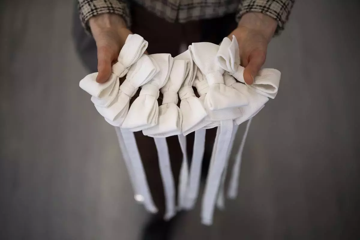 An employee holds bow ties in Lambert Hofer, a renowned costume workshop in Vienna, Austria, Wednesday, Febr 26, 2025. (AP Photo/Denes Erdos)