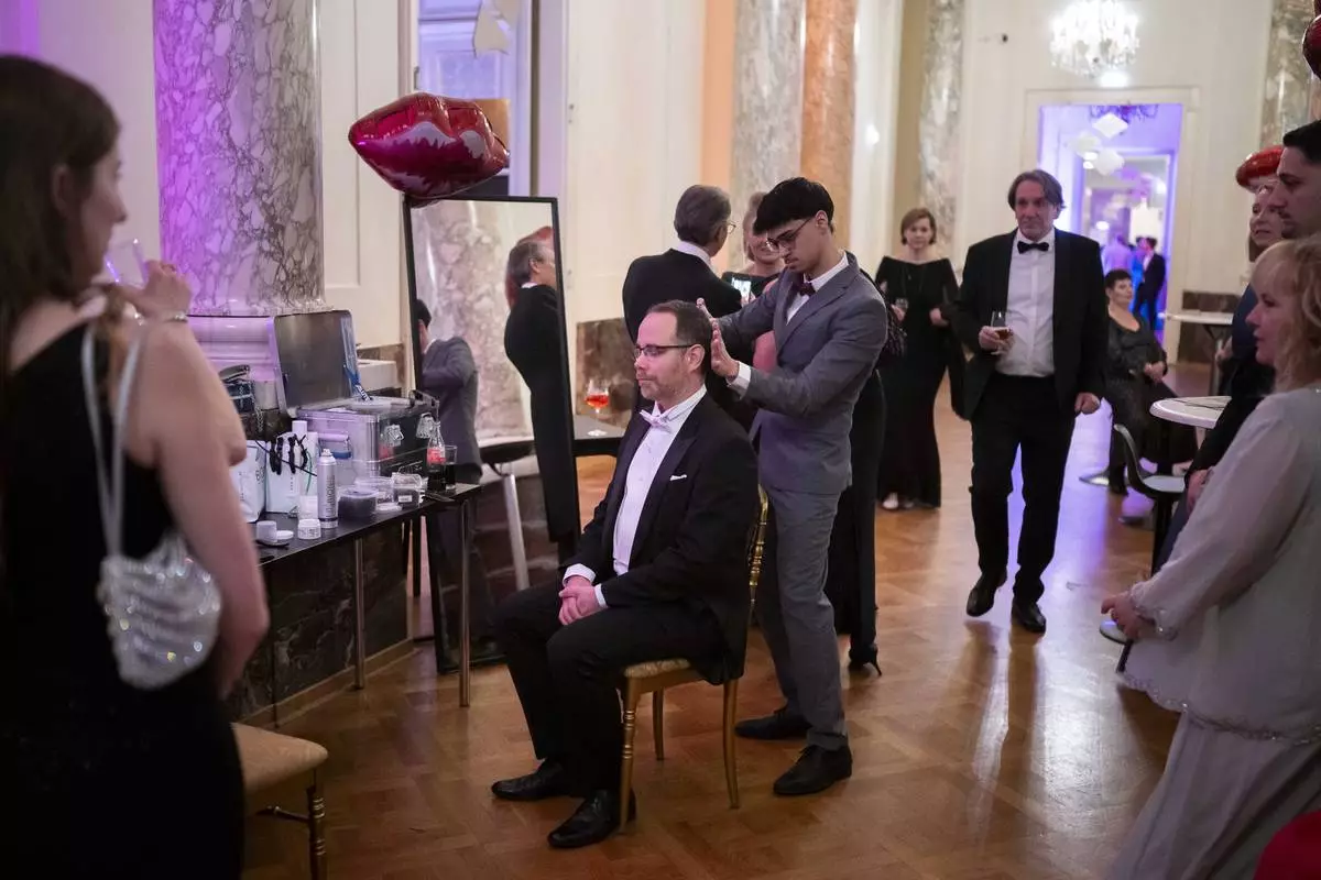 A hairdresser straightens a man's hair during the opening ceremony of the Lawyers' Ball in Vienna, Austria, Saturday, March 1, 2025. (AP Photo/Denes Erdos)
