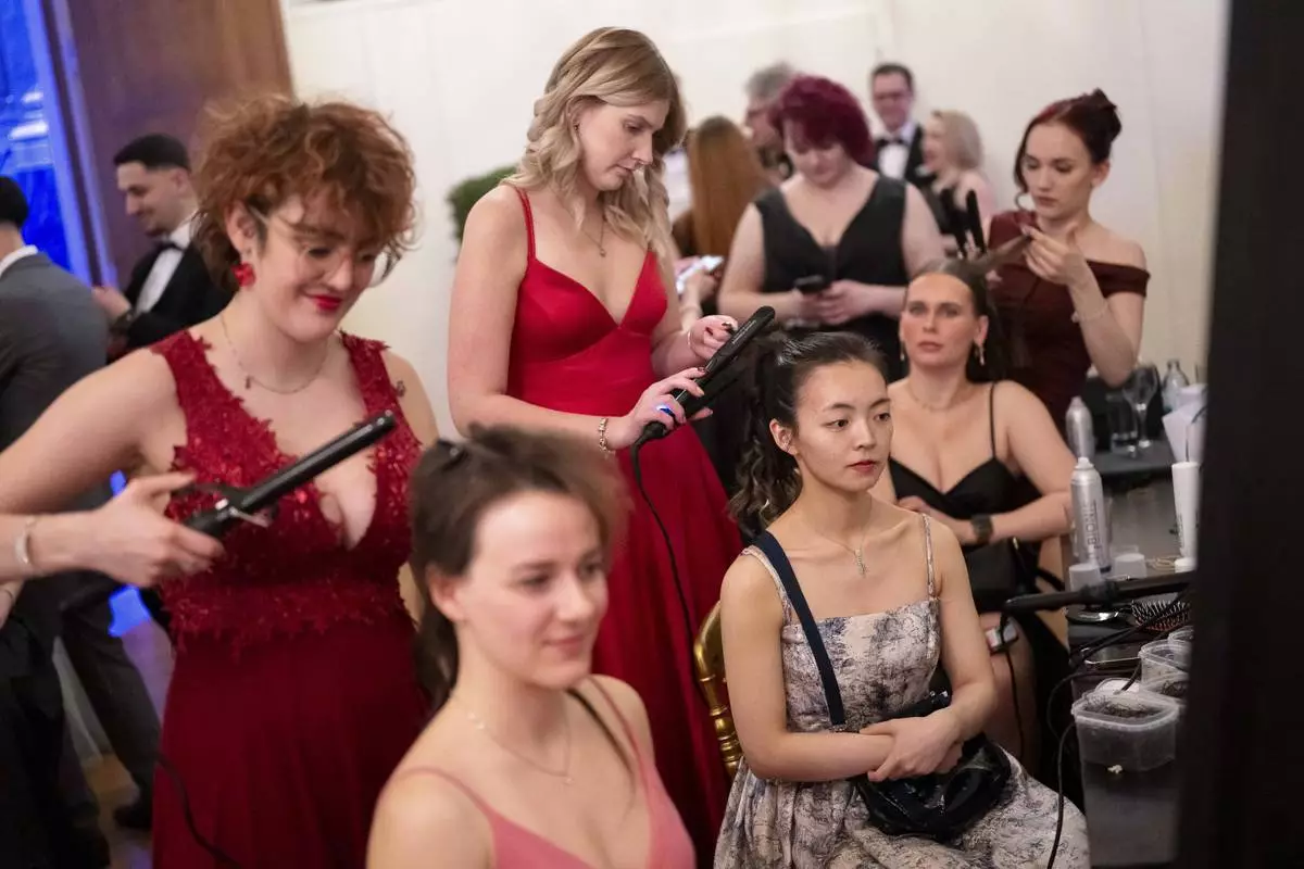 Women adjust each others hair during the Lawyers' Ball in Vienna, Austria, Saturday, March 1, 2025. (AP Photo/Denes Erdos)