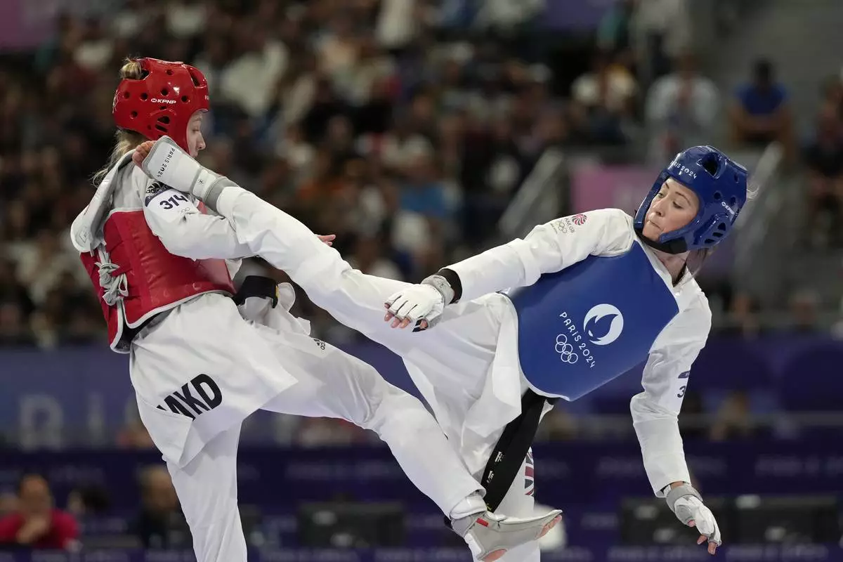Britain's Jade Jones, right, competes with North Macedonia's Miljana Reljikj in a women's 57kg Taekwondo match during the 2024 Summer Olympics, at the Grand Palais, Thursday, Aug. 8, 2024, in Paris, France. (AP Photo/Andrew Medichini, File)