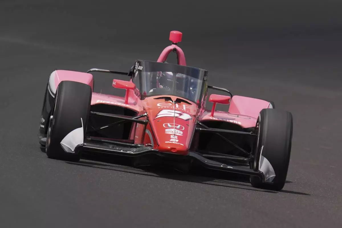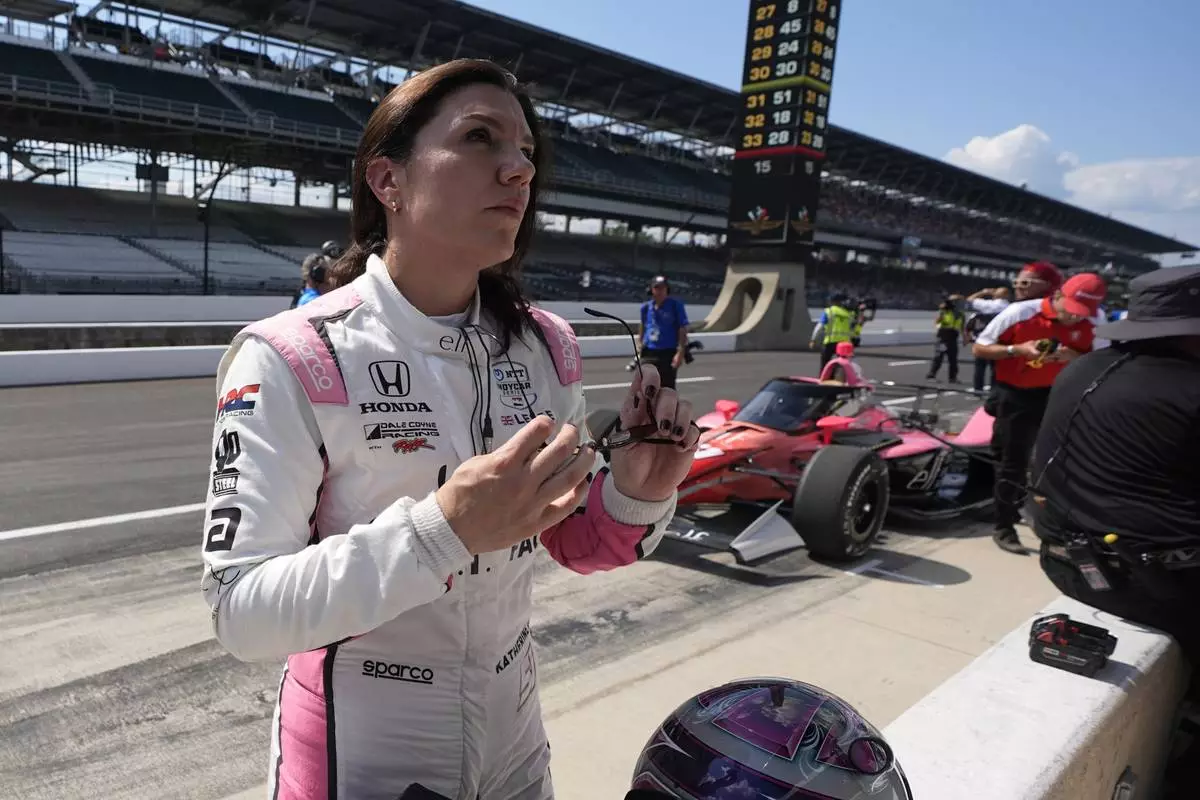 FILE - Katherine Legge, of England, prepares to drive during practice for the Indianapolis 500 auto race at Indianapolis Motor Speedway in Indianapolis, Wednesday, May 15, 2024. (AP Photo/Michael Conroy, File)