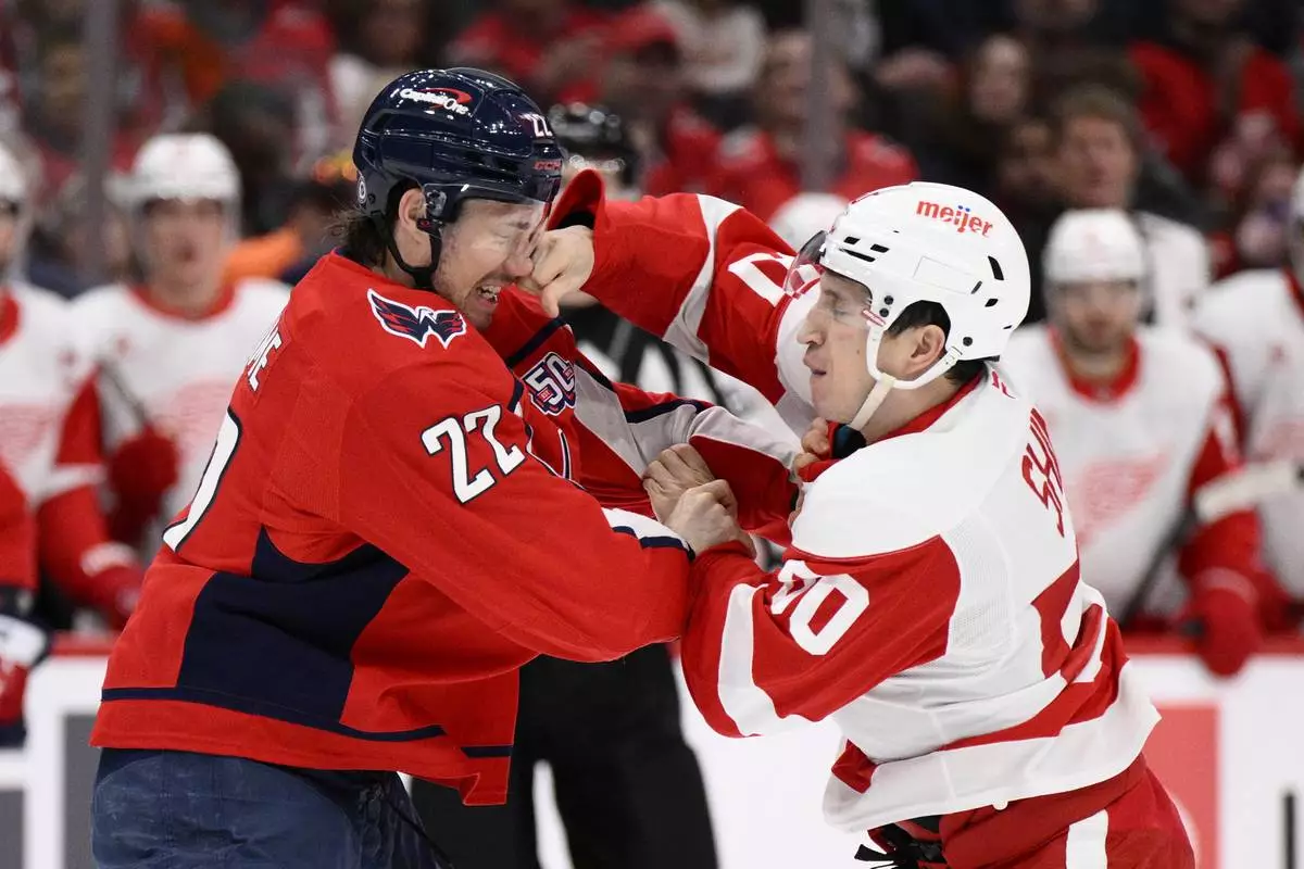 Detroit Red Wings right wing Dominik Shine, right, fights Washington Capitals right wing Brandon Duhaime (22) during the first period of an NHL hockey game, Friday, March 7, 2025, in Washington. (AP Photo/Nick Wass)