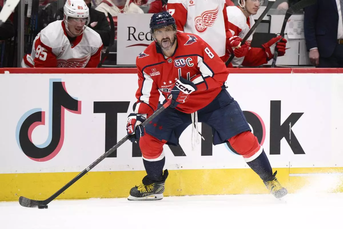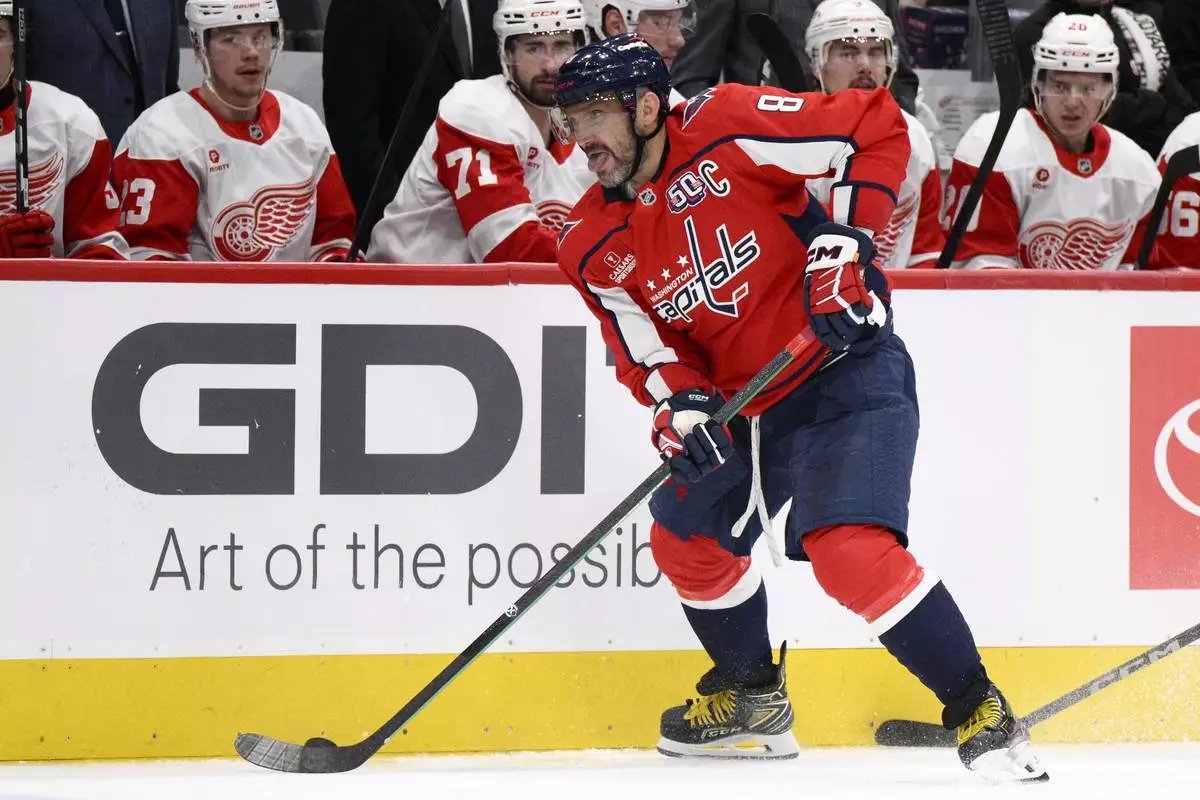 Washington Capitals left wing Alex Ovechkin (8) skates with the puck during the second period of an NHL hockey game against the Detroit Red Wings, Friday, March 7, 2025, in Washington. (AP Photo/Nick Wass)