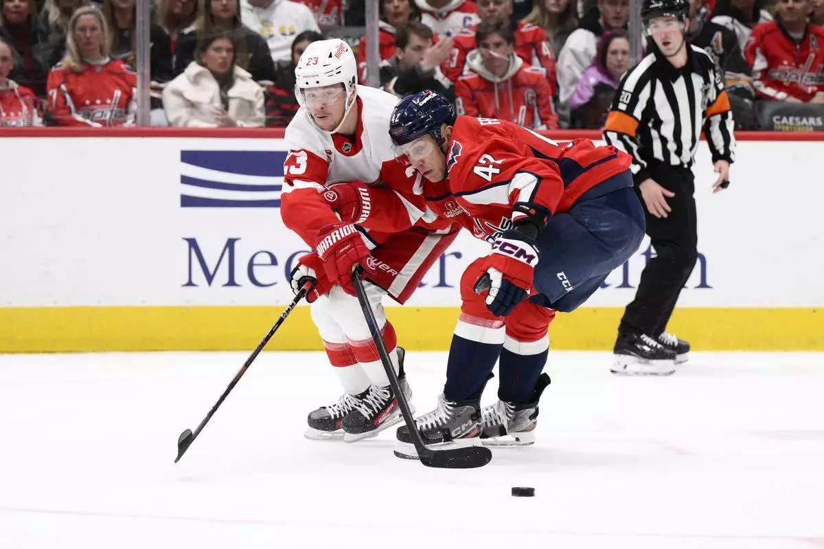 Detroit Red Wings left wing Lucas Raymond (23) and Washington Capitals defenseman Martin Fehervary (42) battle for the puck during the second period of an NHL hockey game, Friday, March 7, 2025, in Washington. (AP Photo/Nick Wass)