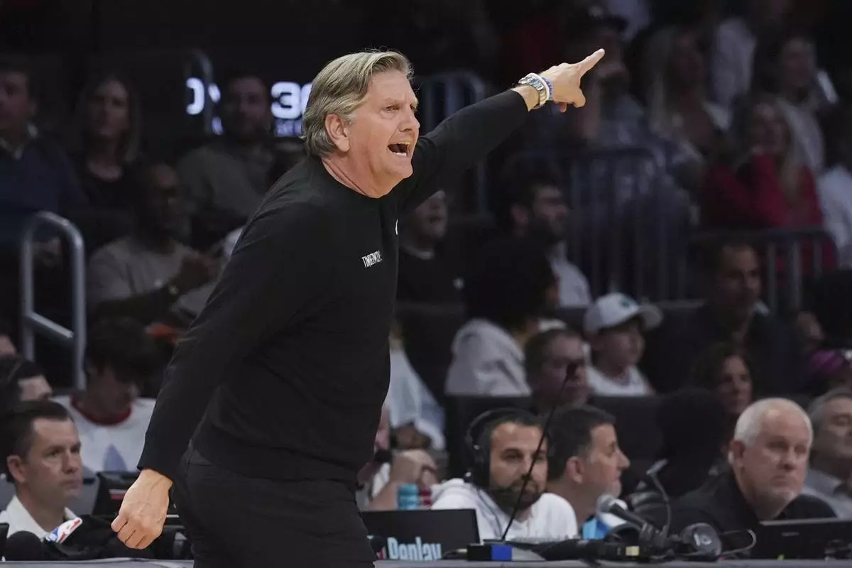 Minnesota Timberwolves head coach Chris Finch gestures during the second half of an NBA basketball game against the Miami Heat, Friday, March 7, 2025, in Miami. (AP Photo/Marta Lavandier)