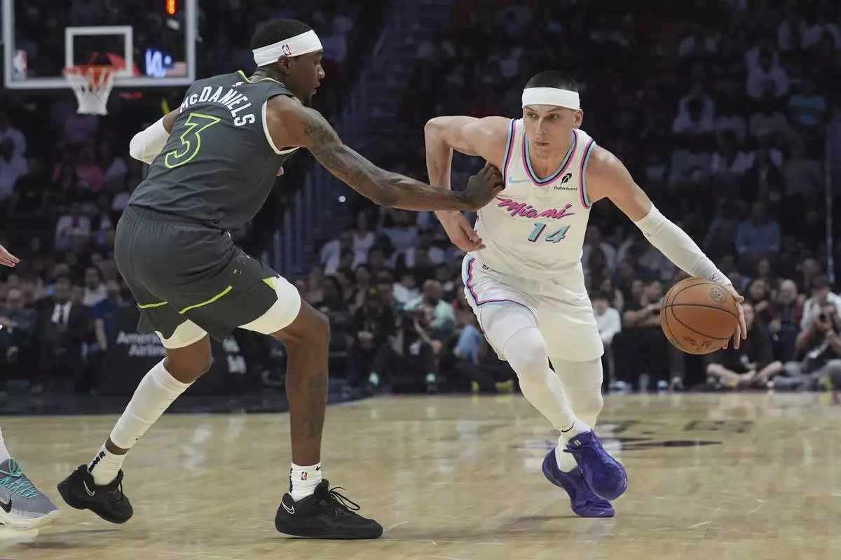 Miami Heat guard Tyler Herro (14) dribbles the ball as Minnesota Timberwolves forward Jaden McDaniels (3) defends during the first half of an NBA basketball game, Friday, March 7, 2025, in Miami. (AP Photo/Marta Lavandier)