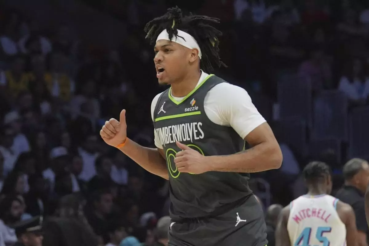 Minnesota Timberwolves guard Terrence Shannon Jr. (00) gestures after scoring during the first half of an NBA basketball game against the Miami Heat, Friday, March 7, 2025, in Miami. (AP Photo/Marta Lavandier)