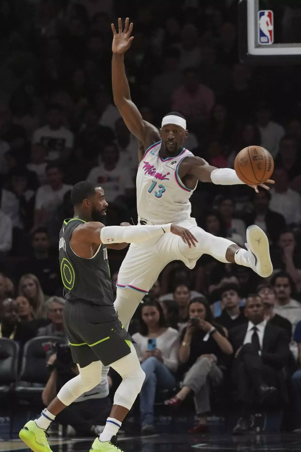 Minnesota Timberwolves guard Mike Conley (10) passes the ball as Miami Heat center Bam Adebayo (13) defends during the first half of an NBA basketball game, Friday, March 7, 2025, in Miami. (AP Photo/Marta Lavandier)