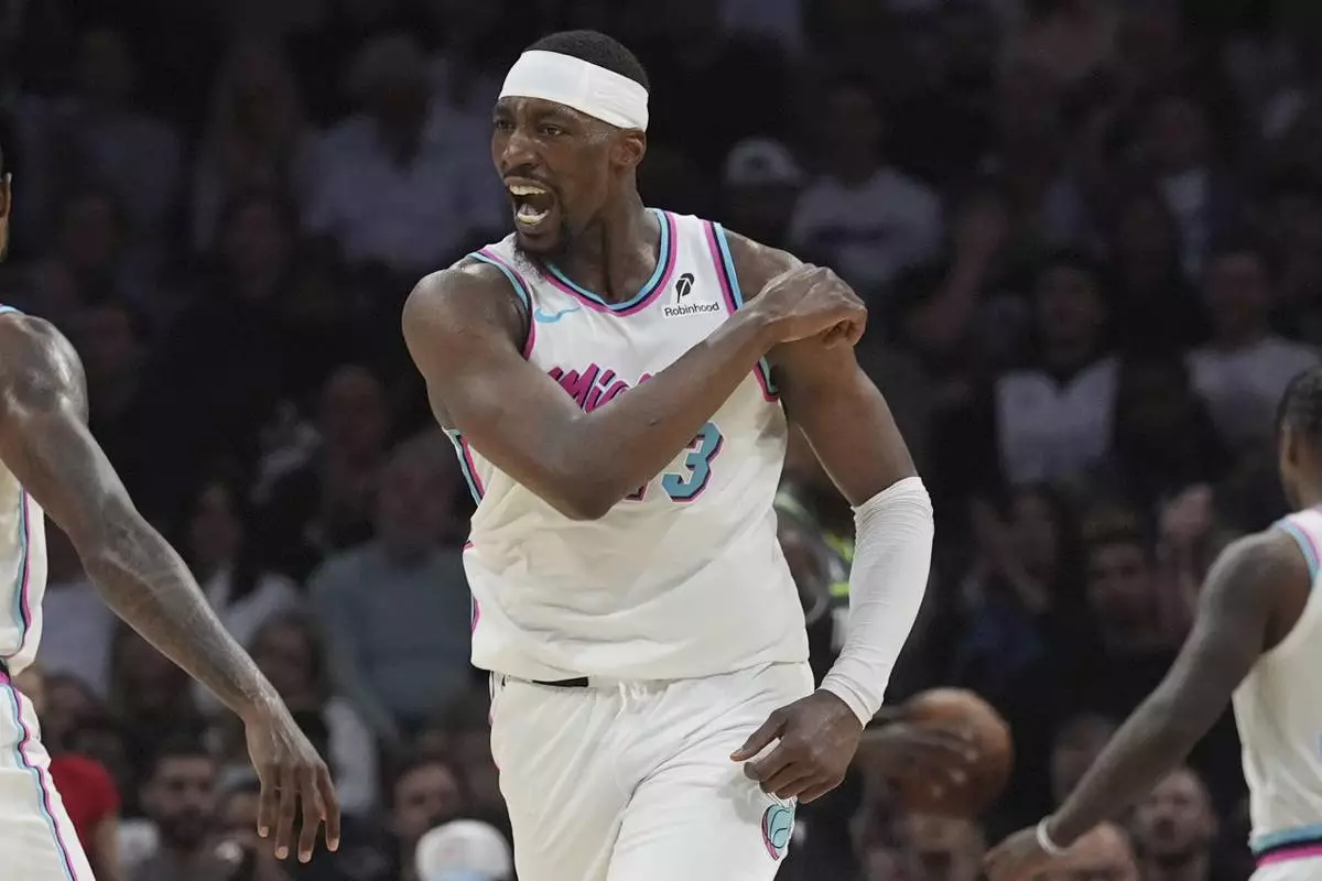 Miami Heat center Bam Adebayo (13) gestures after scoring during the second half of an NBA basketball game against the Minnesota Timberwolves, Friday, March 7, 2025, in Miami. (AP Photo/Marta Lavandier)
