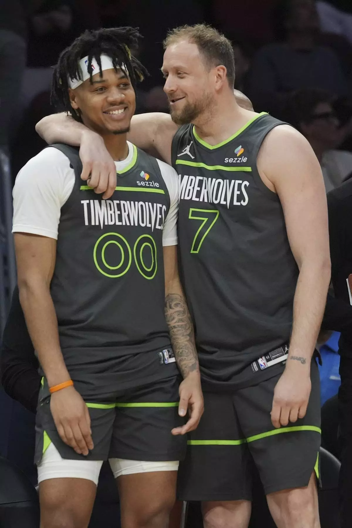 Minnesota Timberwolves guard Terrence Shannon Jr. (00) and guard Joe Ingles (7) celebrate after defeating the Miami Heat during an NBA basketball game, Friday, March 7, 2025, in Miami. (AP Photo/Marta Lavandier)