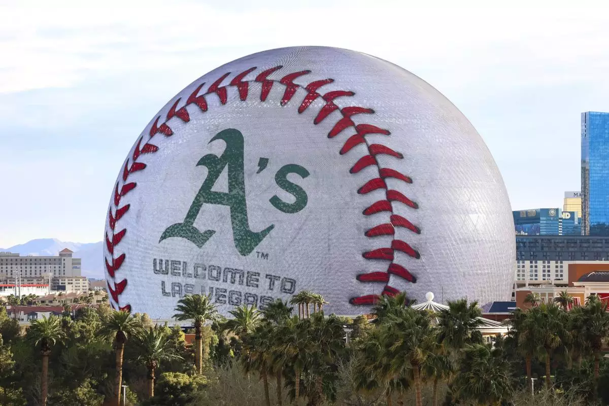 The Athletics logo is displayed on The Sphere, Friday, March 7, 2025, in Las Vegas. (Wade Vandervort/Las Vegas Sun via AP)
