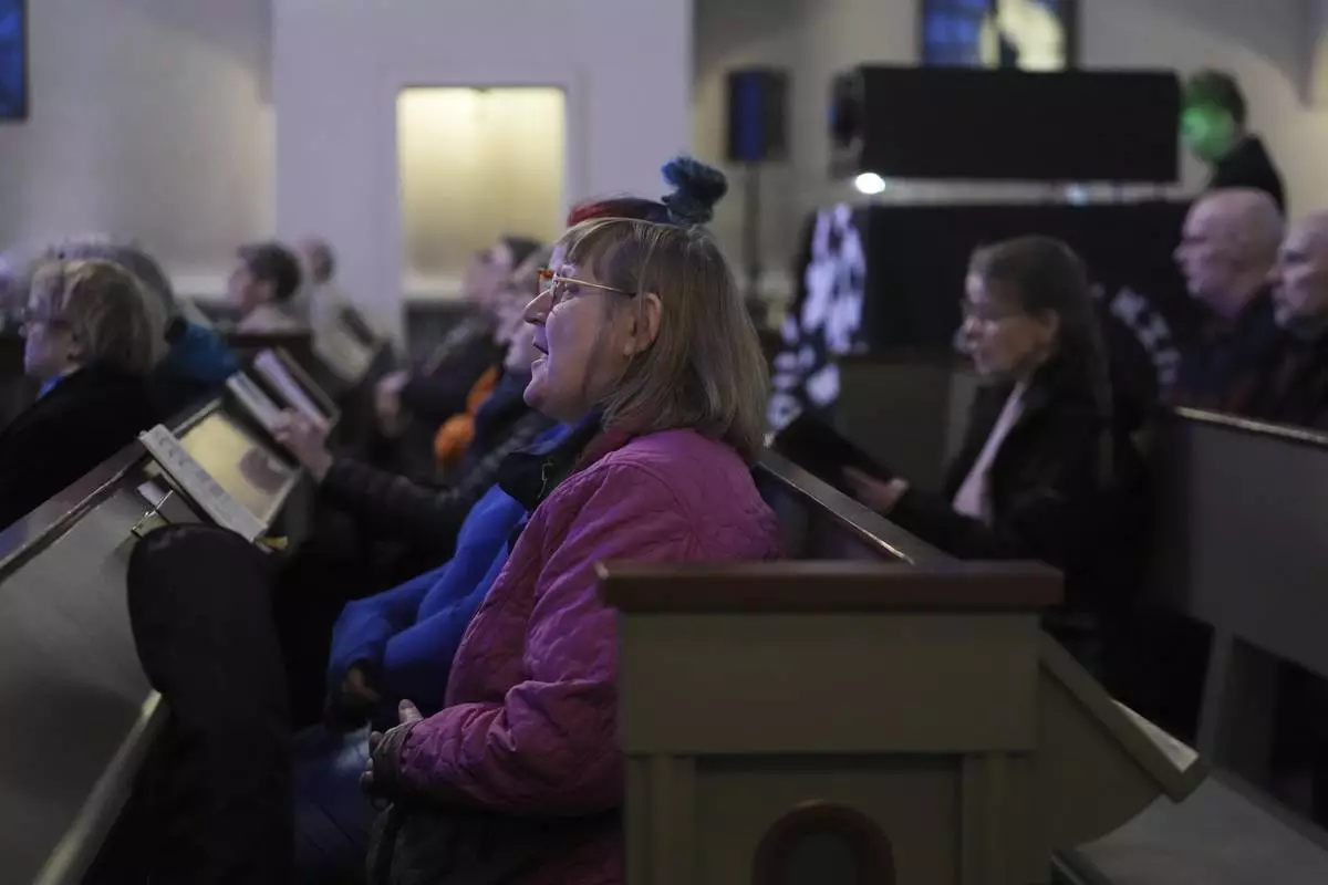 People sing as they attend an AI-created service at St. Paul's Lutheran church in Helsinki, Finland, Tuesday, March 4, 2025. (AP Photo/Sergei Grits)