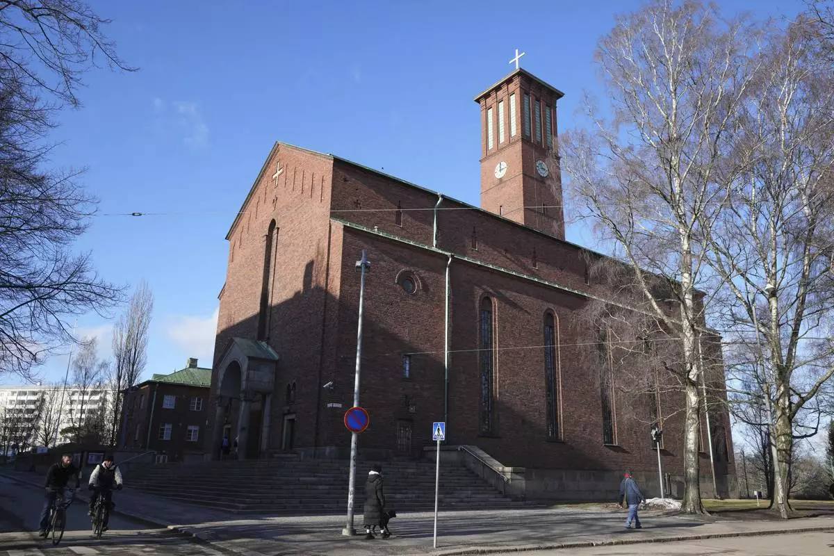 People pass by St. Paul's Lutheran church in Helsinki, Finland, Tuesday, March 4, 2025. (AP Photo/Sergei Grits)