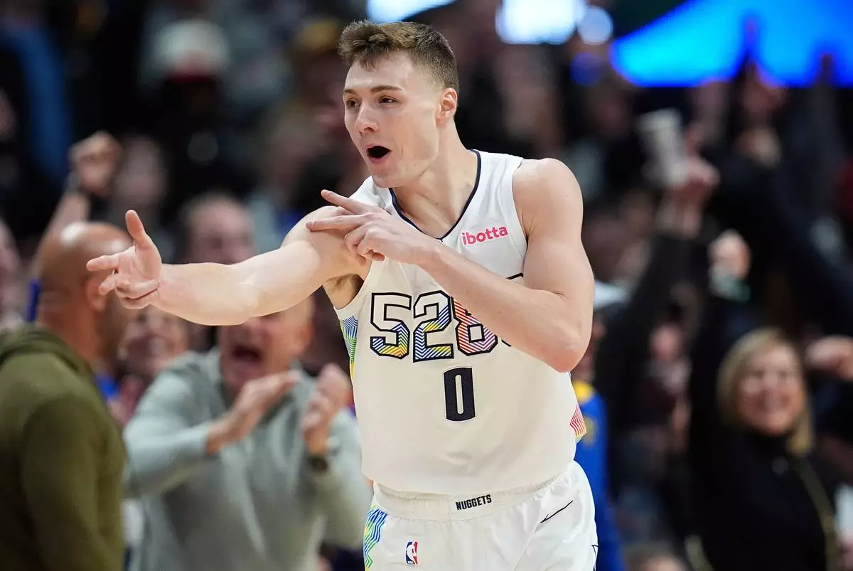 Denver Nuggets guard Christian Braun reacts after hitting a 3-point basket in overtime of an NBA basketball game against the Phoenix Suns, Friday, March 7, 2025, in Denver. (AP Photo/David Zalubowski)