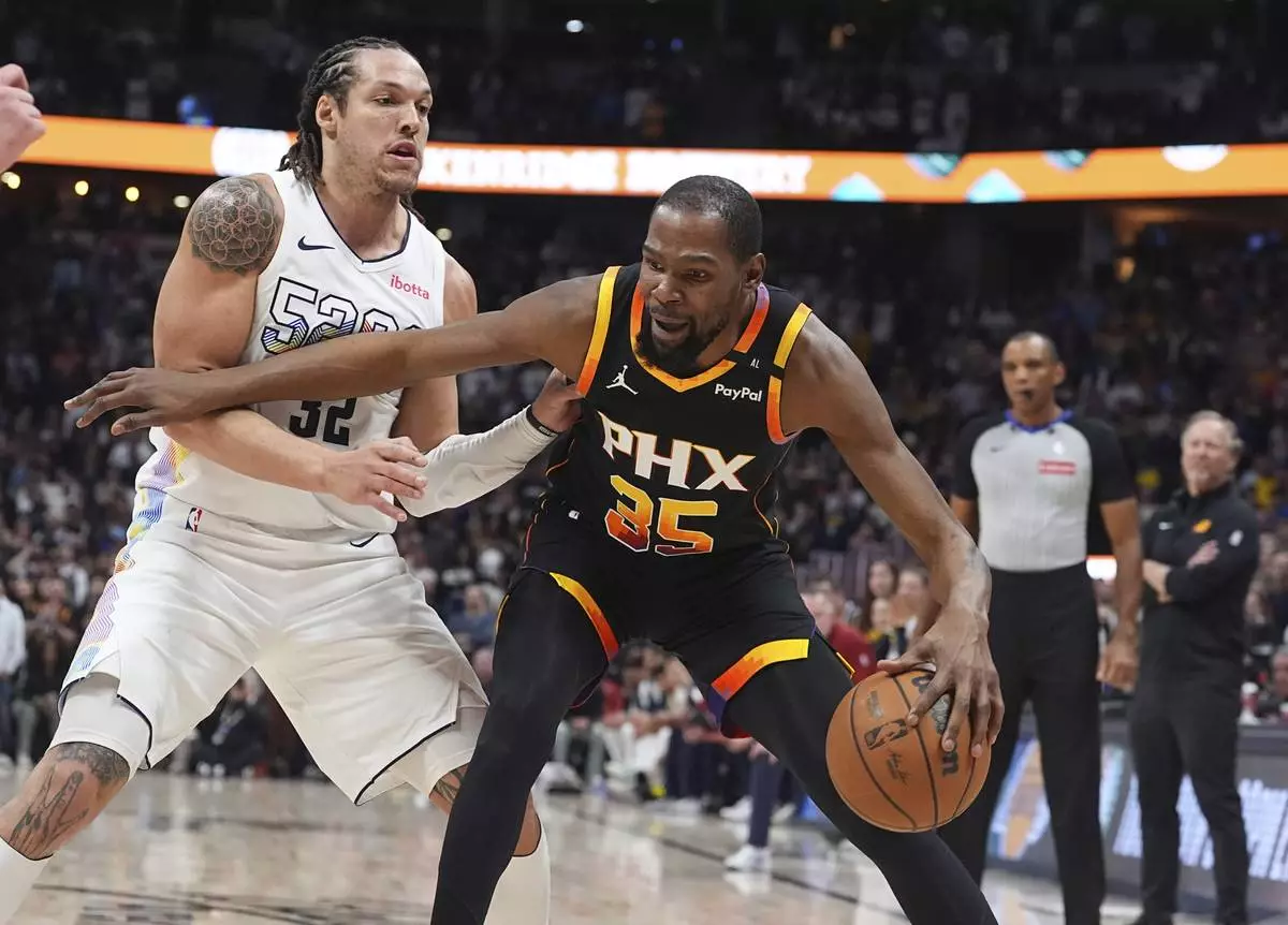 Phoenix Suns forward Kevin Durant (35) drives past Denver Nuggets forward Aaron Gordon in overtime of an NBA basketball game Friday, March 7, 2025, in Denver. (AP Photo/David Zalubowski)