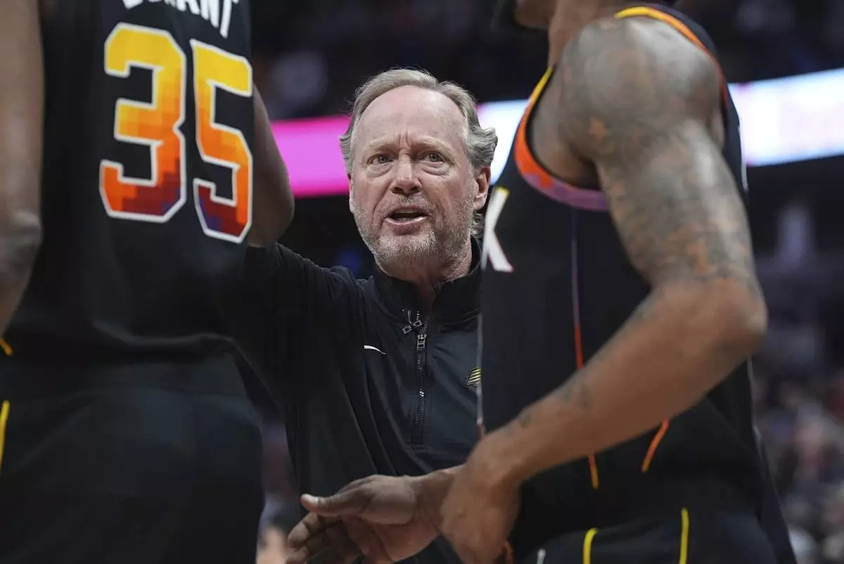 Phoenix Suns head coach Mike Budenholzer directs his team during a timeout in the first half of an NBA basketball game against the Denver Nuggets, Friday, March 7, 2025, in Denver. (AP Photo/David Zalubowski)