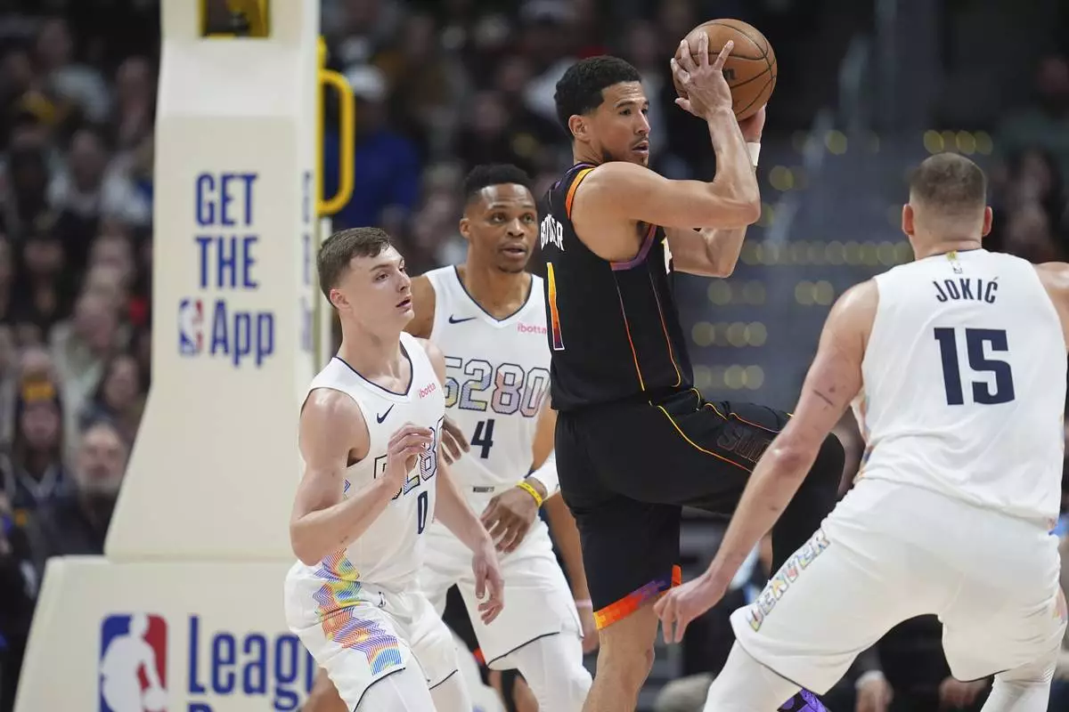 Phoenix Suns guard Devin Booker, third from left, passes the ball as, from left, Denver Nuggets guards Christian Braun and Russell Westbrook and center Nikola Jokic defend in the first half of an NBA basketball game Friday, March 7, 2025, in Denver. (AP Photo/David Zalubowski)