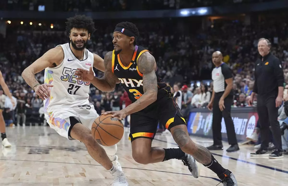 Phoenix Suns guard Bradley Beal, right, drives past Denver Nuggets guard Jamal Murray in overtime of an NBA basketball game Friday, March 7, 2025, in Denver. (AP Photo/David Zalubowski)