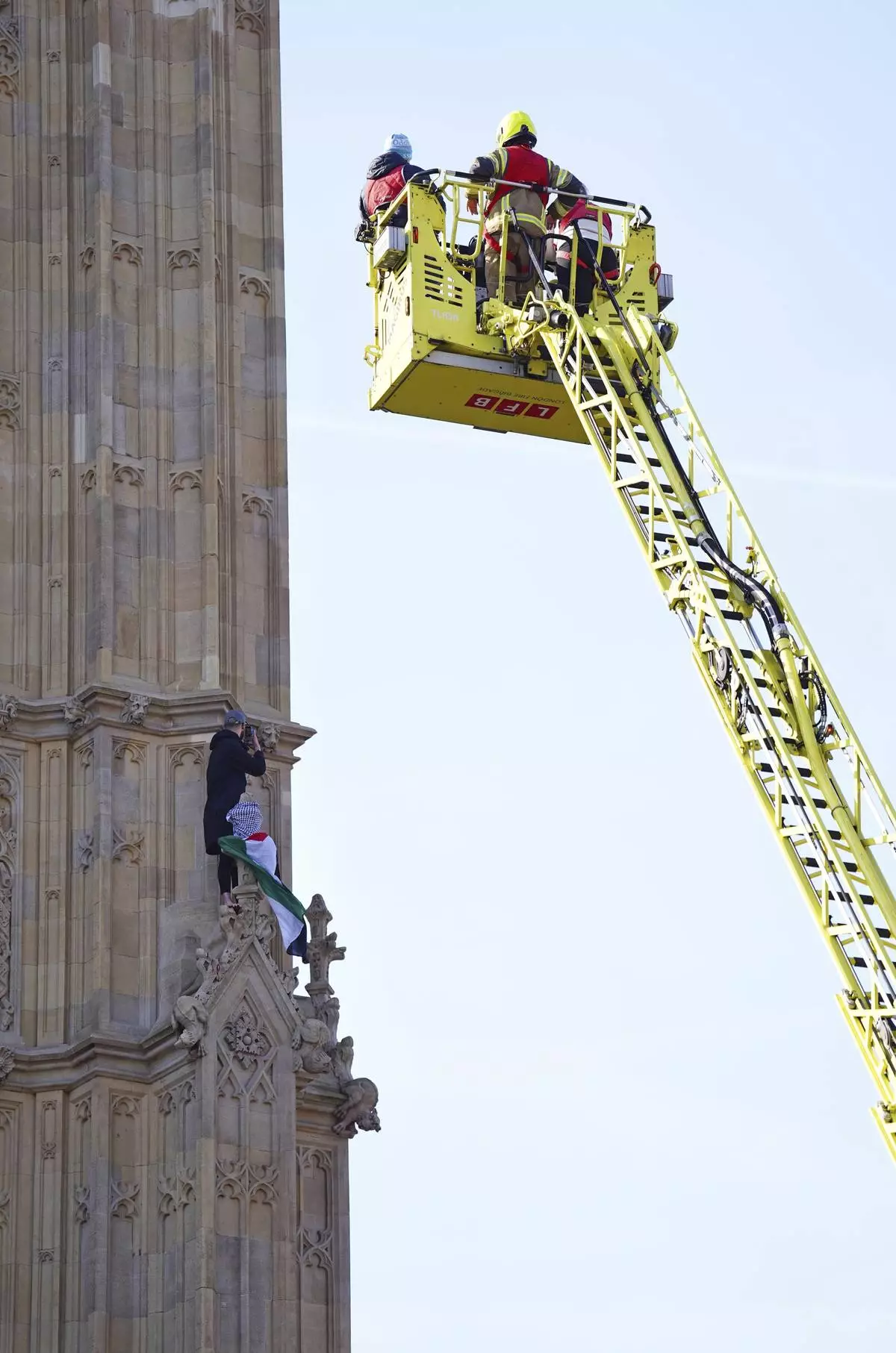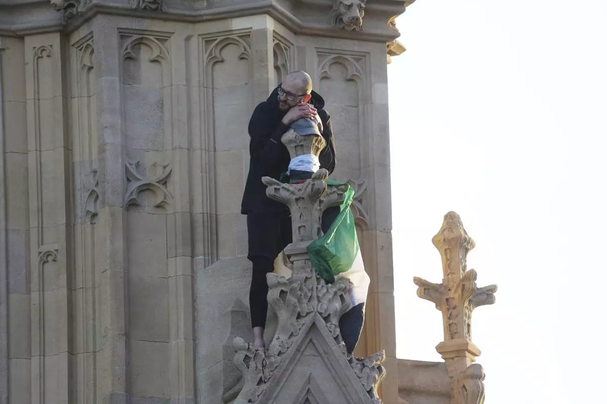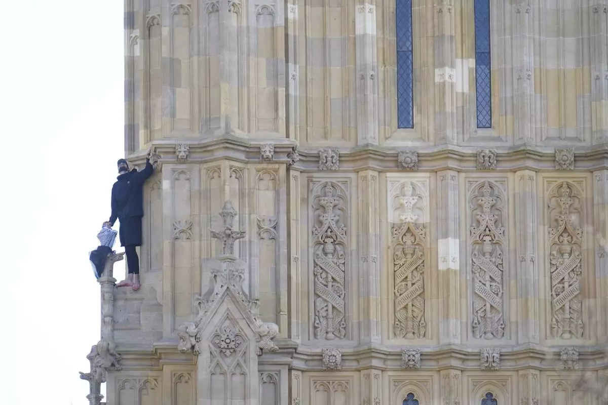 LONDON (AP) — Traffic around the Palace of Westminster in London came to a standstill for much of Saturday as emergency crews tried to reach a man who climbed the Big Ben tower holding a Palestinian flag.