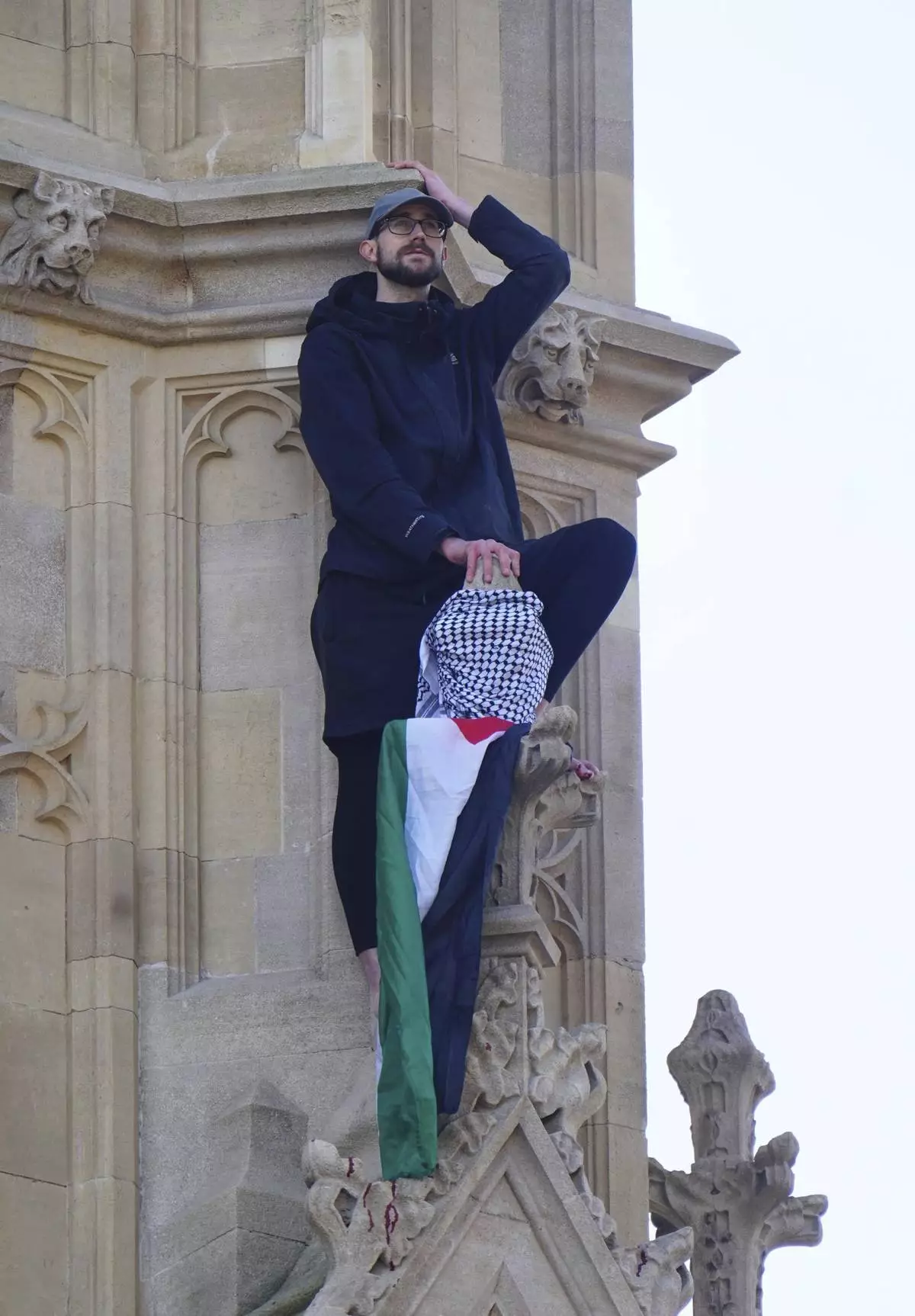 A man with a Palestinian flag after he climbed up Elizabeth Tower, at the Palace of Westminster in London, Saturday, March 8, 2025. (Jeff Moore/PA via AP)