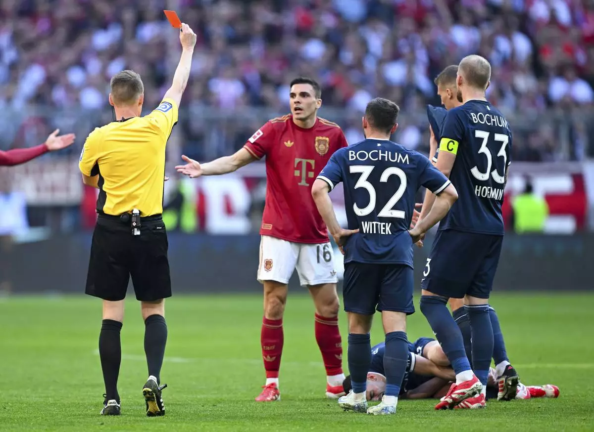 Bayern's Joao Palhinha is shown a red card by referee Christian Dingert during the German Bundesliga soccer match between Bayern Munich and VfL Bochum at the Allianz Arena in Munich, Germany, Saturday, March 8, 2025. (Sven Hoppe/dpa via AP)