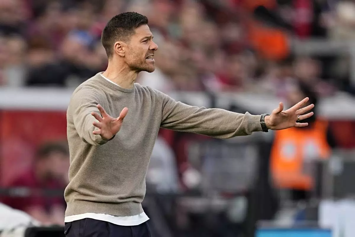 Leverkusen's head coach Xabi Alonso reacts during the Bundesliga soccer match between Bayer Leverkusen and Werder Bremen at the BayArena in Leverkusen, Germany, Saturday, March 8, 2025. (AP Photo/Martin Meissner)