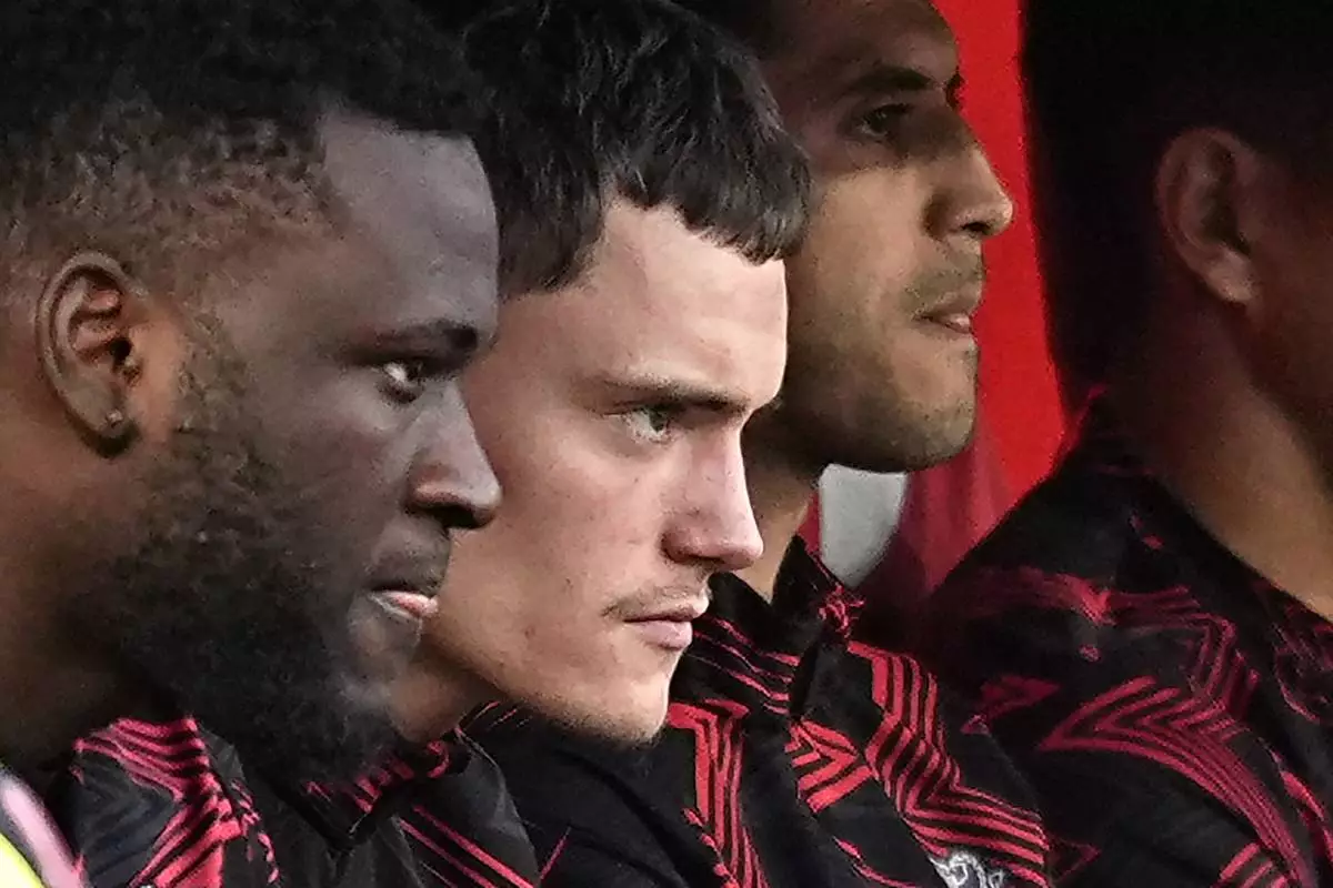 Leverkusen's Victor Boniface and Florian Wirtz react disappointed on the benchduring the Bundesliga soccer match between Bayer Leverkusen and Werder Bremen at the BayArena in Leverkusen, Germany, Saturday, March 8, 2025. (AP Photo/Martin Meissner)