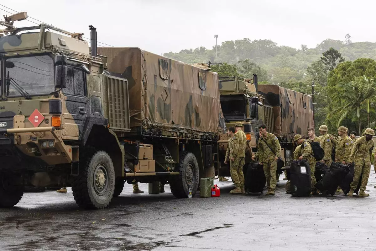 Australian Army soldiers from 8th/9th Battalion arrive in Lismore, Australia, Friday, March 7, 2025 to assist northern New South Wales communities in the wake of Tropical Cyclone Alfred. (WO2 Raymond Vance/Australian Defence Dept. via AP)