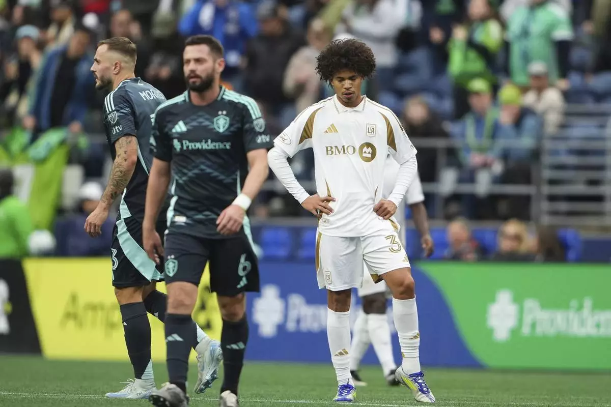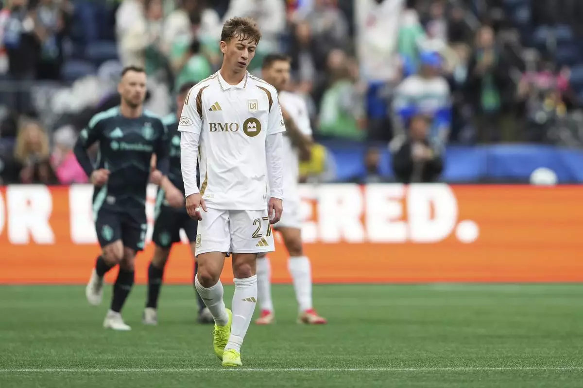 Los Angeles FC forward Nathan Ordaz (27) walks back to midfield after a goal by Seattle Sounders midfielder Cristian Roldan during the second half of an MLS soccer match Saturday, March 8, 2025, in Seattle. (AP Photo/Lindsey Wasson)