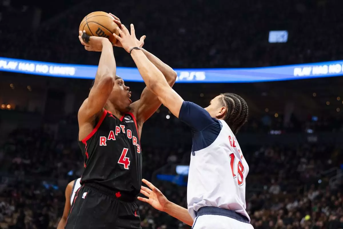 Toronto Raptors guard Scottie Barnes (4) passes the ball over Washington Wizards forward Kyshawn George (18) during the first half of NBA action in Toronto on Saturday, March 8, 2025. THE CANADIAN PRESS/Thomas Skrlj/The Canadian Press via AP)