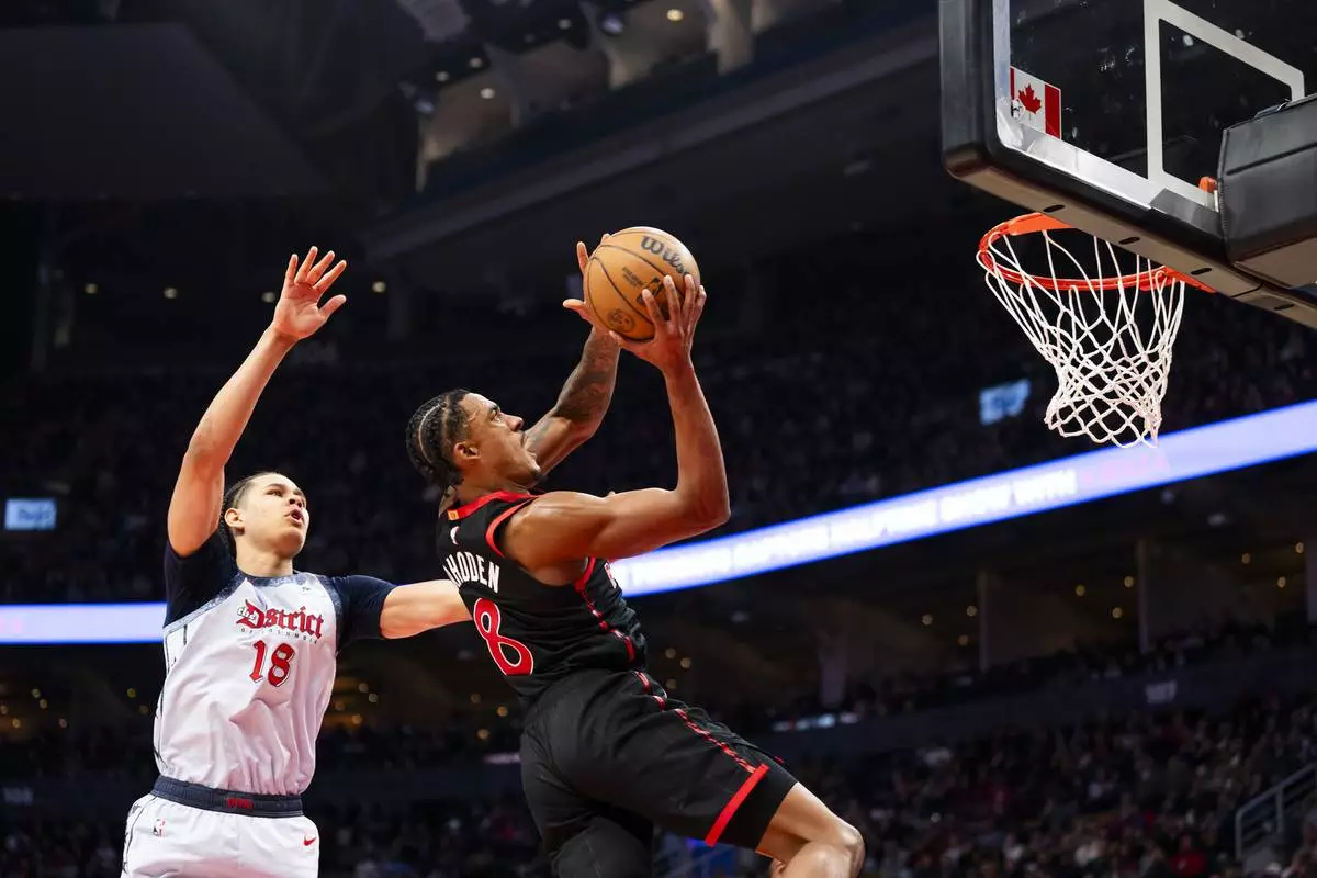 Toronto Raptors guard Jared Rhoden (8) drives the net against defending Washington Wizard forward Kyshawn George (18) during the first half of NBA action in Toronto on Saturday, March 8, 2025. THE CANADIAN PRESS/Thomas Skrlj/The Canadian Press via AP)