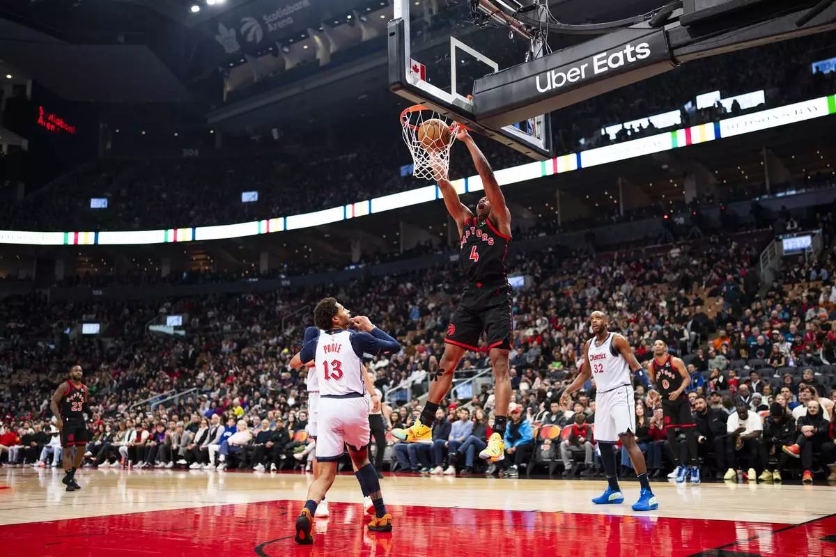 Toronto Raptors guard Scottie Barnes (4) dunks the ball past defending Washington Wizards guard Jordan Poole during the first half of NBA action in Toronto on Saturday, March 8, 2025. (Thomas Skrlj/The Canadian Press via AP)