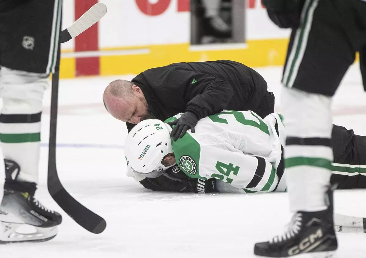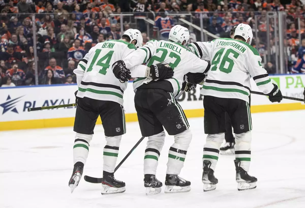 Dallas Stars' Esa Lindell (23) is helped off the ice by teammates Jamie Benn (14) and Ilya Lyubushkin (46) after being injured against the Edmonton Oilers during the second period of an NHL hockey game in Edmonton, Alberta, Saturday, March 8, 2025. (Jason Franson/The Canadian Press via AP)