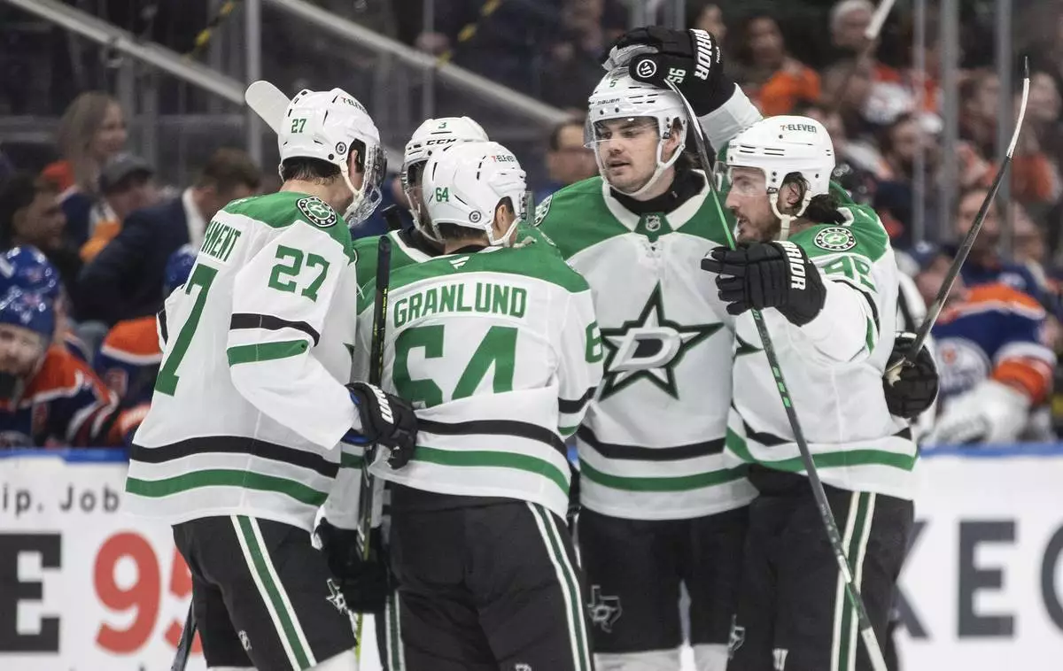 Dallas Stars' Mason Marchment (27), Mikael Granlund (64), Matt Dumba (3), Nils Lundkvist (5) and Matt Duchene (95) celebrate a goal against the Edmonton Oilers during the third period of an NHL hockey game in Edmonton, Alberta, Saturday, March 8, 2025. (Jason Franson/The Canadian Press via AP)