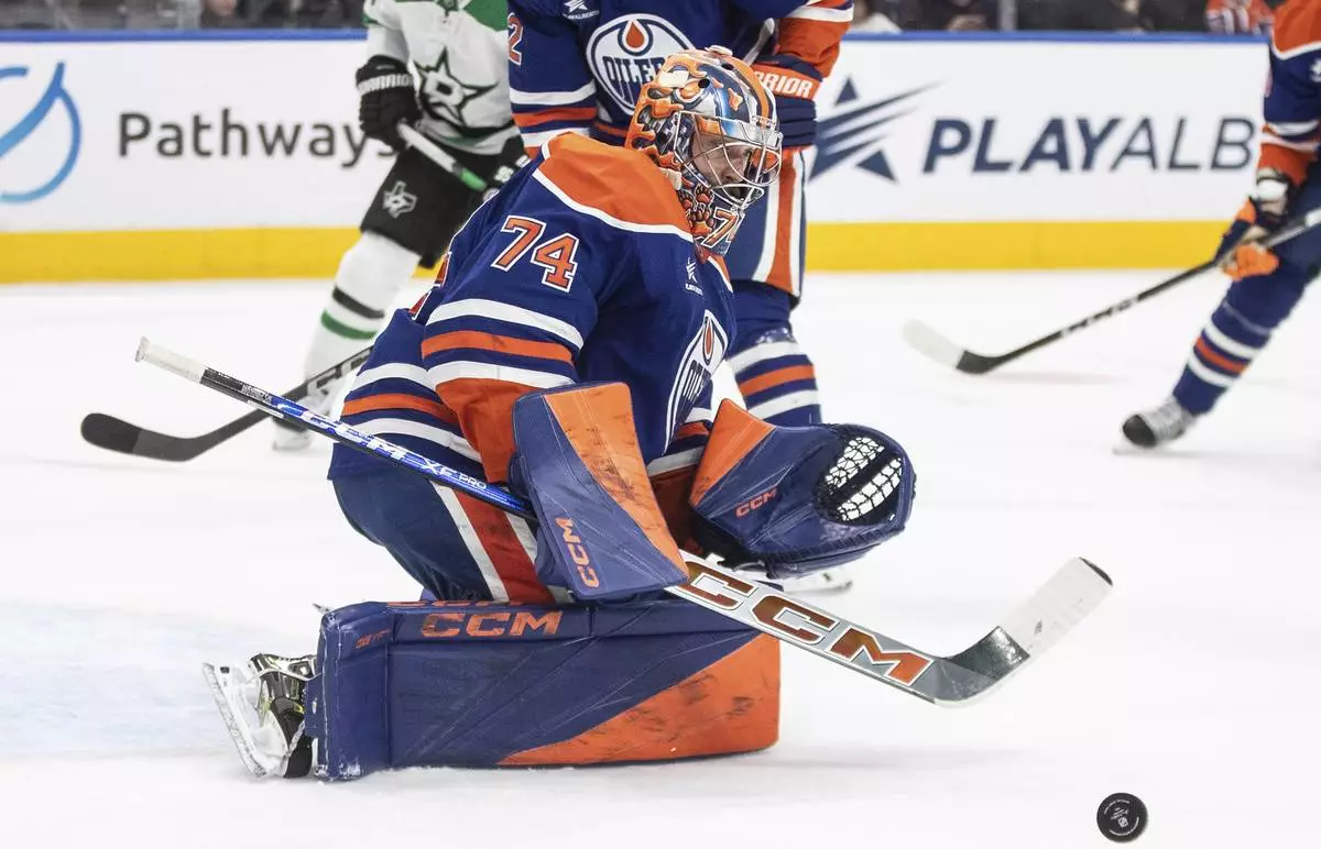 Edmonton Oilers goalie Stuart Skinner (74) makes a save against the Dallas Stars during the first period of an NHL hockey game in Edmonton, Alberta, Saturday, March 8, 2025. (Jason Franson/The Canadian Press via AP)