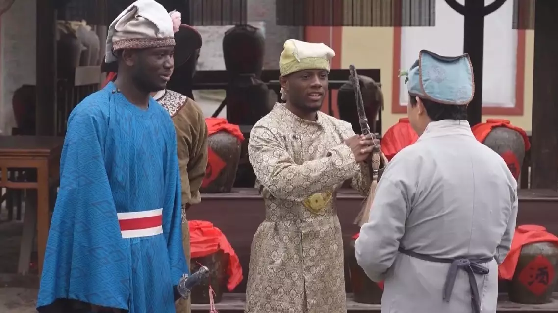 Wearing ancient Chinese costumes and holding related props, Dabira Vianny, a student from Brazzaville, capital of the Republic of Congo, has fully enjoyed his character in a swordsman-themed movie scene at the experience zone of movie extras with his friend.